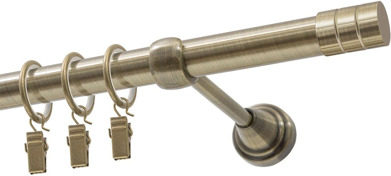 Karnisz FORIO pojedynczy antyk 160 cm Karnisz FORIO pojedynczy w eleganckim stylu antycznym, idealny do nowoczesnych i klasycznych wnętrz. Wykonany z mocnej stali galwanizowanej, karnisz zapewnia nie tylko stylowy wygląd, ale także wysoką trwałość i odporność na uszkodzenia, jest doskonałym rozwiązaniem dla różnych pomieszczeń, wprowadzając harmonię i elegancję do Twojego wnętrza. Jednym z najważniejszych atutów karnisza FORIO są zastosowane kółka z wkładką PCV, które umożliwiają ciche przesuwanie zasłon i firan, eliminując nieprzyjemne dźwięki. Zakończenie karnisza w formie walca, ozdobione delikatnymi nacięciami, dodaje mu wyjątkowego charakteru, będąc jednocześnie subtelnym akcentem dekoracyjnym. W skład zestawu wchodzą: drążek 160 cm, 14 kółek z żabką, dwa wsporniki, dwa zakończenia FORIO oraz kołki montażowe. Wybierając karnisz FORIO, inwestujesz w elegancki i funkcjonalny element, który podkreśli urok Twoich zasłon i firan, a jego uniwersalny styl doskonale wpisuje się w różnorodne aranżacje.