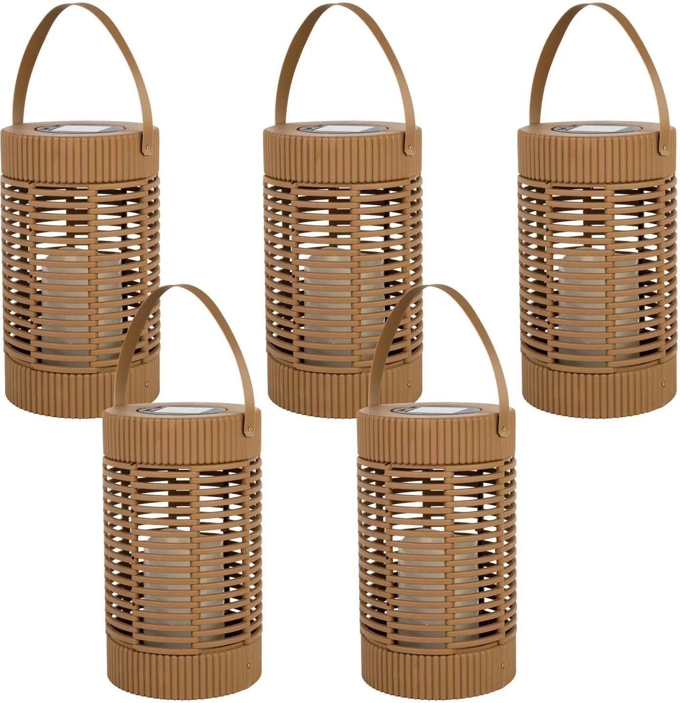 Zestaw 5 latarni solarnych RATTA 1xLED Oświetlenie solarne to ekologiczne i wyjątkowo praktyczne rozwiązanie, które pozwala bez wysiłku podkreślić architekturę ogrodu oraz stworzyć w nim magiczną atmosferę po zmroku. Wprowadź ciepły, przytulny klimat do swojego ogrodu, balkonu lub tarasu dzięki solarnej latarence RATTA Jej klasyczny design nawiązuje do wiklinowych lampionów, a żółte światło migoczące jak świeca nadaje wieczorom niepowtarzalny nastrój. To idealny wybór dla miłośników relaksu w otoczeniu natury i subtelnego oświetlenia. Zasilanie słoneczne dla wygody i energooszczędności Latarenka wyposażona jest w 1 żółtą diodę LED, która imituje naturalne światło płomienia. Dzięki wbudowanemu panelowi solarnemu typu amorficznego, RATTA ładuje się automatycznie w ciągu dnia, by po zmroku rozświetlić przestrzeń bez użycia prądu. Zasilana jest akumulatorem, który można wielokrotnie ładować, co czyni ją produktem przyjaznym dla środowiska i oszczędnym w eksploatacji. Trwała i wygodna w montażu lampa ogrodowa Dzięki poręcznemu uchwytowi, latarenkę można łatwo zawiesić na gałęzi, pergoli lub haczyku - lub po prostu postawić na stole ogrodowym czy schodkach. Latarenka została wykonana z wytrzymałego tworzywa sztucznego, które dobrze znosi zmienne warunki atmosferyczne. Dane techniczne: Wymiary: średnica 14 cm, wysokość 24 cm Źródło światła: 1x LED żółta Panel solarny: 1x amorficzny Materiał: tworzywo sztuczne Uchwyt: zintegrowany - do zawieszenia
