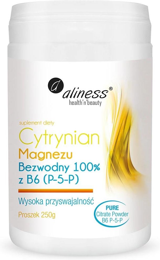 Aliness Cytrynian Magnezu z B6 (P-5-P) 250g Aliness Cytrynian magnezu zawiera magnez w łatwo przyswajalnej formie cytrynianu magnezu. Zapewnia to bardzo dobre wchłanianie z układu pokarmowego oraz uzupełnienie niedoborów. Dodatkowo preparat został wzbogacony o ważny pierwiastek jakim jest potas. Jest on niezbędny do prawidłowego funkcjonowania mięśni, a także pełni istotną rolę w utrzymanie prawidłowego ciśnienia krwii. Magnez jest bardzo cennym minerałem. Zapewnia prawidłowe funkcjonowanie całego organizmu. Bierze udział w przewodnictwie nerwowym. Wpływa na pracę komórek nerwowych. Zapewnia prawidłową koncentrację oraz wspomaga walkę ze stresem. Poprawia jakość snu, ma działanie uspokajające. Właściwości:  Magnez: pomaga w utrzymaniu równowagi elektrolitowej pomaga w utrzymaniu zdrowych zębów pomaga w utrzymaniu zdrowych kości przyczynia się do utrzymania prawidłowego metabolizmu energetycznego pomaga w prawidłowym funkcjonowaniu mięśni pomaga w prawidłowym funkcjonowaniu układu nerwowego przyczynia się do zmniejszenia uczucia zmęczenia i znużenia pomaga w utrzymaniu prawidłowych funkcji psychologicznych pomaga w prawidłowej syntezie białka odgrywa rolę w procesie podziału komórek przyczynia się do prawidłowego rozwoju kości u dzieci Witamina B6 (w postaci P5P czyli aktywnej formie pirydoksalo-5-fosforan): pomaga w utrzymaniu prawidłowego metabolizmu homocysteiny pomaga w prawidłowej syntezie cysteiny przyczynia się do utrzymania prawidłowego metabolizmu białka i glikogenu pomaga w prawidłowym funkcjonowaniu układu nerwowego pomaga w prawidłowej produkcji czerwonych krwinek pomaga w prawidłowym funkcjonowaniu układu odpornościowego przyczynia się do regulacji aktywności hormonalnej przyczynia się do utrzymania prawidłowego metabolizmu energetycznego pomaga w utrzymaniu prawidłowych funkcji psychologicznych Składniki: Magnez (cytrynian magnezu), witamina B6 (pirydoksalo-5-fosforan ). Sposób użycia: 1/4 lub 1/2 miarki dziennie w trakcie posiłku. Proszek należy rozpuścić w letniej wodzie i wypić. ***Nie należy przekraczać zalecanej porcji do spożycia w ciągu dnia. Produkt nie może być stosowany jako substytut zróżnicowanej diety. Zaleca się stosowanie zróżnicowanej i zrównoważonej diety i zdrowego trybu życia.