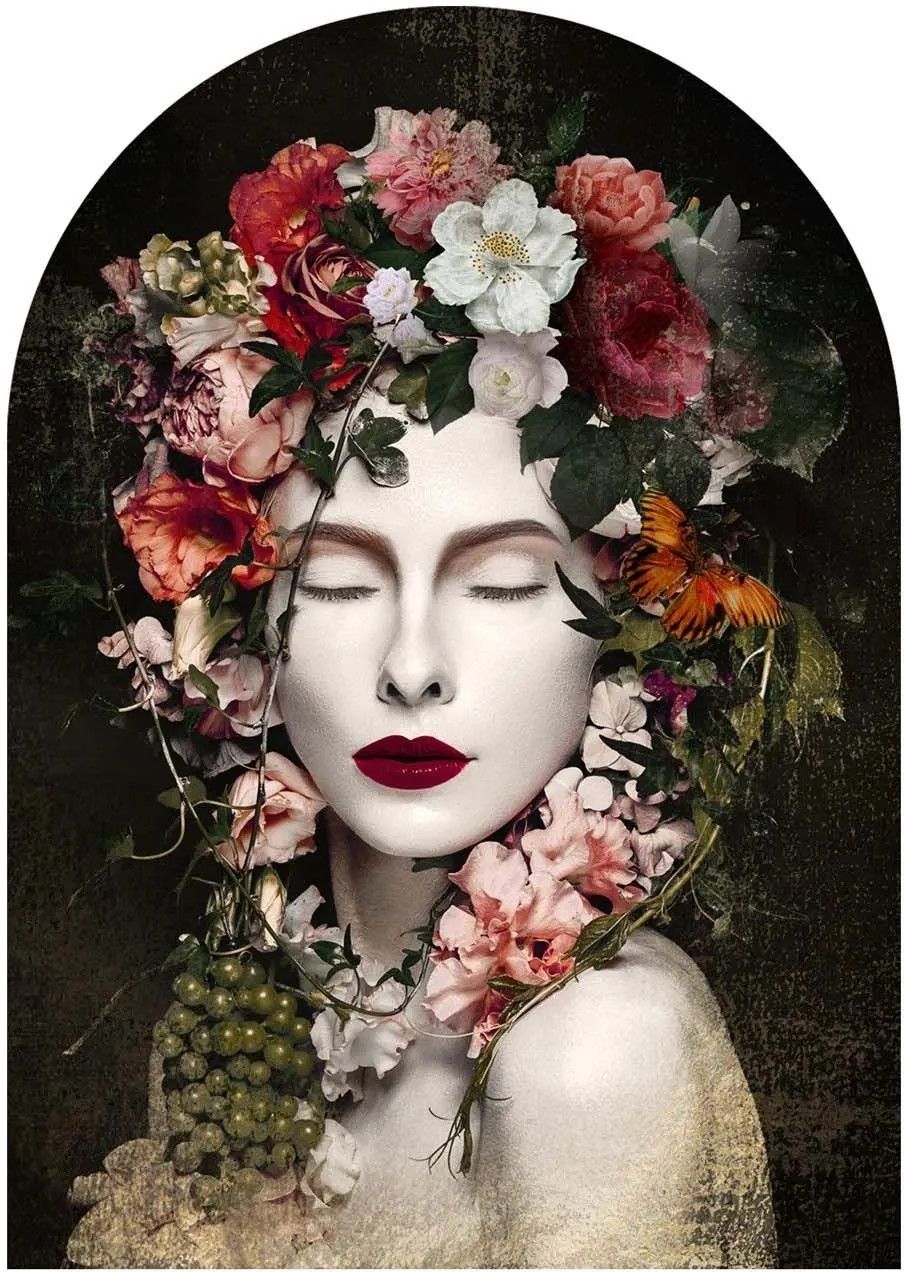 STYLER Obraz Glasspik Arched DIANA GS004 70 x 100 cm Piękny obraz na szkle przedstawiający kobietę w wieńcu z kwiatów. Seria Arched ma unikatowy kształt i modne, nowoczesne wzory. Glasspik - kolekcja obrazów na szkle Odkryj unikalną kolekcję obrazów drukowanych na szkle z użyciem metalicznej folii, …