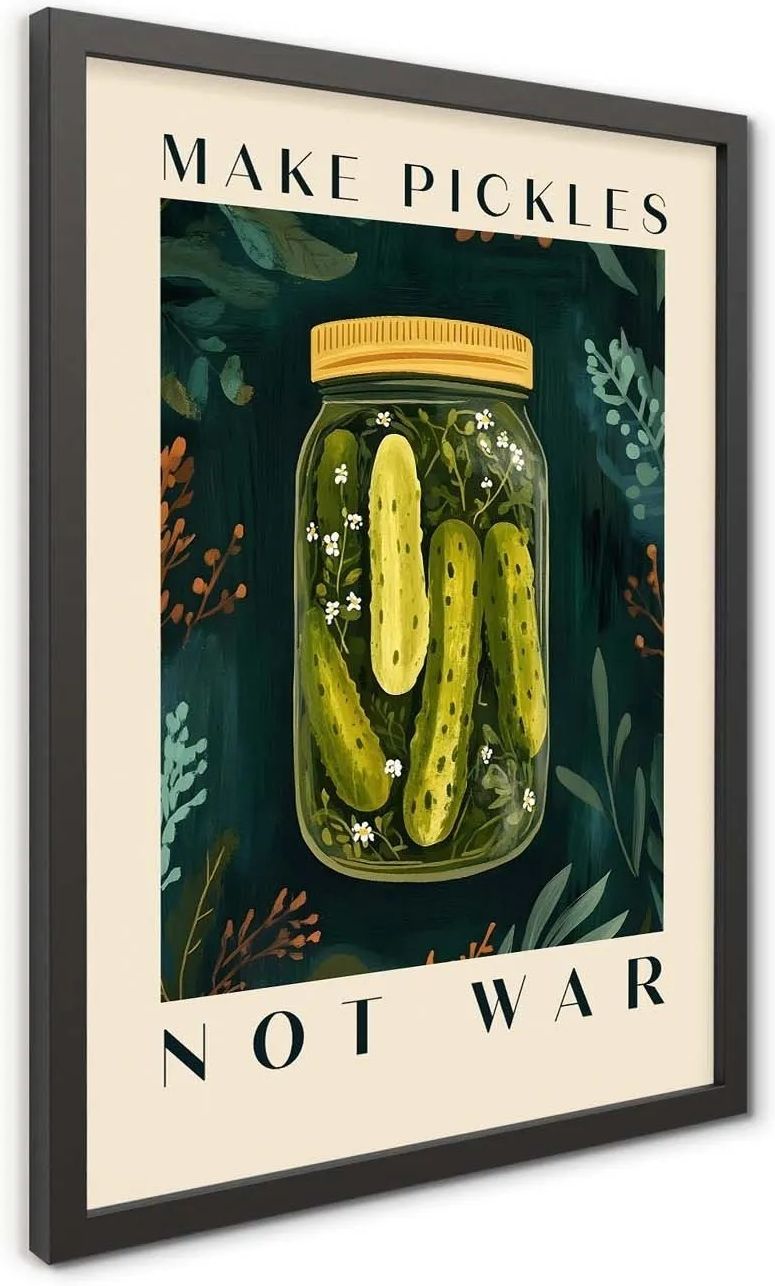 STYLER Obraz Modernpik PICKLES FR420 30 x 40 cm Pomysłowy, nowoczesny plakat idealny do kuchni lub lokalu gastronomicznego. Modernpik - nowoczesne tematy Seria obrazów Modernpik to nowoczesne, czasem humorystyczne motywy zaprezentowane w estetycznej, modnej i dynamicznej formie. Świetne nie tylko do domu, ale także do przestrzeni komercyjnych, lokali usługowych, restauracji. Dodaj wnętrzu stylu i głębi Odpowiednio dopasowany obraz stanowi idealny akcent dekoracyjny, który natychmiast odmieni charakter pomieszczenia i nada mu indywidualnego wyrazu. Z bogatej oferty marki Styler możesz wybrać wzór, który wkomponuje się w nowoczesny, minimalistyczny salon, jak również modele doskonałe do klasycznych, bardziej tradycyjnie urządzonych sypialni czy pomieszczeń biurowych. To prosty sposób na wprowadzenie koloru i unikalnej tekstury do domu, restauracji, wnętrz hotelowych. Najmodniejsze trendy i solidne wykonanie Obrazy marki Styler zostały zaprojektowane zgodnie z najmodniejszymi trendami wnętrzarskimi, dlatego każdy znajdzie wśród nich wzór dla siebie. Staranne wykonanie z solidnych i trwałych materiałów gwarantuje ich estetykę oraz długą żywotność bez utraty jakości czy świeżości kolorów. W ten sposób inwestujesz w dekorację, która posłuży przez lata.