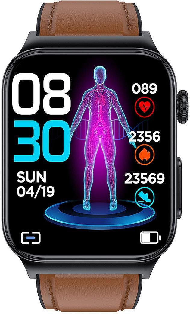 Watchmark Cardio One Brązowy Watchmark Cardio One Brązowy to nowoczesny smartwatch, który łączy elegancję z funkcjonalnością. Dzięki brązowemu paskowi z eko-skóry i nowoczesnemu designowi, stanowi doskonały dodatek do codziennego stroju. Oferuje szereg zaawansowanych funkcji, które wspierają aktywność fizyczną oraz monitorują stan zdrowia użytkownika. Wybierając ten model, zyskujesz nie tylko stylowy zegarek, ale także inteligentnego asystenta zdrowia. Bateria i wydajność Jednym z kluczowych aspektów, na który warto zwrócić uwagę przy wyborze smartwatcha, jest czas pracy baterii. Model Watchmark Cardio One został wyposażony w akumulator o pojemności 280 mAh, co zapewnia długi czas działania w trybie normalnym. Dzięki technologii Li-Ion, użytkownicy mogą cieszyć się jego funkcjami bez konieczności częstego ładowania. Smartwatch wyróżnia się także trybem oszczędzania energii, co dodatkowo wydłuża czas pracy baterii. W rezultacie można korzystać z wszystkich funkcji tego smartwatcha podczas intensywnego dnia pracy, treningów czy codziennych obowiązków, bez obawy o nagłe wyczerpanie baterii. Funkcje zdrowotne i sportowe Watchmark Cardio One to nie tylko zegarek, ale także prawdziwy asystent zdrowia, który oferuje szereg funkcji wspierających aktywność fizyczną oraz monitorowanie stanu zdrowia. Dzięki zaawansowanym czujnikom, smartwatch umożliwia: monitorowanie tętna, krokomierz, pomiar pulsu, monitor snu, tryby sportowe. Dzięki tym funkcjom, smartwatch staje się niezastąpionym towarzyszem dla każdego, kto pragnie dbać o swoje zdrowie i kondycję. Kompatybilność i łączność Zgodność z systemami operacyjnymi to istotny aspekt, który należy uwzględnić, wybierając smartwatch. Watchmark Cardio One jest kompatybilny z systemem Android oraz iOS, co sprawia, że może być używany przez szeroką gamę użytkowników. Synchronizacja z telefonem odbywa się za pomocą Bluetooth, co zapewnia łatwe łączenie z aplikacjami mobilnymi, takimi jak H Band, które umożliwiają analizowanie wyników pomiarów. Dzięki technologii Bluetooth 5.0, smartwatch zapewnia stabilne i szybkie połączenie z urządzeniami mobilnymi, co umożliwia korzystanie z powiadomień o wiadomościach i połączeniach bezpośrednio na zegarku. Dodatkowo, dostępna jest funkcja NFC do płatności, co czyni go jeszcze bardziej funkcjonalnym narzędziem w codziennym życiu. System operacyjny i wyświetlacz Watchmark Cardio One działa na systemie Android, co otwiera przed użytkownikami szeroką gamę możliwości. Umożliwia to instalowanie różnych aplikacji, które wzbogacają funkcjonalność urządzenia. Sam zegarek wyposażony jest w wyświetlacz IPS o przekątnej 1,83 cala i rozdzielczości 240x240 pikseli. To zapewnia wyraźny obraz oraz żywe kolory, co znacznie podnosi komfort użytkowania. Wymiary i waga Smartwatch charakteryzuje się eleganckimi wymiarami, w tym grubością wynoszącą 12 mm, co sprawia, że jest wygodny w noszeniu na co dzień. Kompaktowe rozmiary i lekka konstrukcja sprawiają, że idealnie sprawdzi się zarówno podczas intensywnych treningów, jak i w codziennym użytkowaniu.