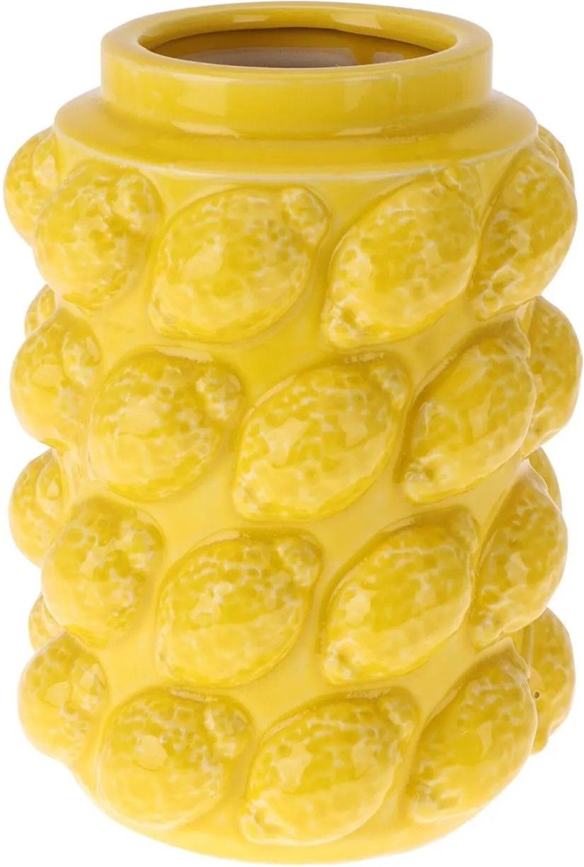 Wazon Cytryna dolomit - 19 cm Wprowadź do swojego wnętrza odrobinę słońca dzięki temu niezwykłemu wazonowi, pokrytemu fakturą soczystych cytryn. Jego intensywny, żółty kolor i błyszczące wykończenie błyskawicznie ożywią pomieszczenie, dodając mu energii i radosnego, wakacyjnego klimatu. To wyrazisty dodatek, który świetnie wygląda zarówno samodzielnie, jak i wypełniony letnim bukietem.