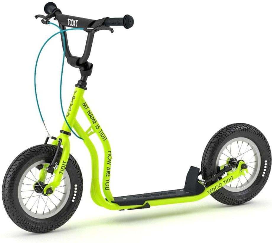 To jest automatyczne tłumaczenie wygenerowane przez software:Hulajnoga dla tych, którzy już w szatni planują, jak złowią żaby przy jazie lub wreszcie w drodze ze szkoły otworzą zardzewiałą bramę do ogrodu. Tidit ma zupełnie nową wzmocnioną ramę i skuteczne hamulce V-brake na obu kołach, dzięki czemu bezpiecznie radzi sobie z trudniejszym stylem jazdy, trudnymi warunkami i trudniejszym traktowaniem. Chociaż tego nie zalecamy, wiemy, jak nieodparta może być jazda po krawężniku lub zjazd po rampie. Postanowiliśmy więc upewnić się, że hulajnoga też będzie na to gotowa. Poszerzone i wzmocnione chwyty w stylu Yedoo oraz dźwignie hamulców Tektro Dopasowane rozmiarowo chwyty dobrze dopasowują się do dziecięcych rączek, wzmocnione i poszerzone końcówki chronią dłonie dziecka podczas jazdy oraz w przypadku upadku. Klamki hamulcowe junior są łatwe w obsłudze, mają krótki zasięg, działają płynnie, a ich odległość od kierownicy można regulować. Podnóżek Yedoo Obszerny podnóżek zapewnia wystarczająco dużo miejsca do komfortowej jazdy. Antypoślizgowa powierzchnia pokładu przyczynia się do bezpiecznej jazdy nawet w bardziej wymagającym terenie i warunkach pogodowych, takich jak mokra nawierzchnia, liście, błoto. Składany stojak Stojak w pełni zintegrowany z konstrukcją ramy zapewnia stabilne parkowanie hulajnogi. Kolejną dobrą wiadomością jest to, że po złożeniu ma jedynie minimalny wpływ na hulajnogę poruszającą się po terenie. Hamulce i felgi aluminiowe Tektro Wysokiej jakości hamulce są podstawą ogólnego bezpieczeństwa hulajnogi. Uzupełniają je dziecięce klamki hamulcowe o krótkim zasięgu, które są łatwe w obsłudze i przyczyniają się do jeszcze większego bezpieczeństwa. Wysokiej jakości felgi aluminiowe, które są lekkie, mocne i trwałe, zwiększają bezpieczeństwo jazdy. Dwupozycyjny widelec tylny Dwupozycyjny widelec tylny umożliwi ustawienie wysokości podnóżka zarówno na drodze, jak i w terenie.