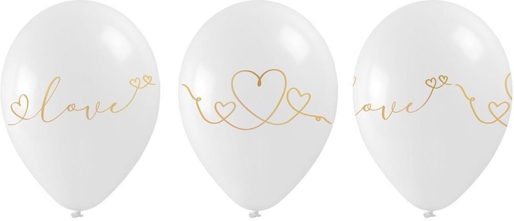 Białe lateksowe balony ze złotym nadrukiem Love o wymiarze 28cm po napompowaniu. Możliwość napełnienia powietrzem lub helem. 5 szt. w opakowaniu. Format: 189x137 mm