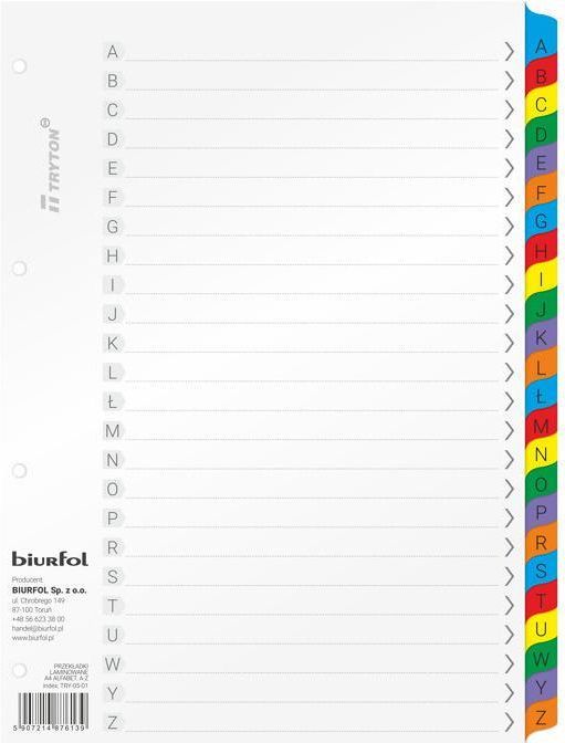 Utrzymane w żywej tonacji kolorystycznej przekładki alfabetyczne marki Biurfol. Laminowane przekładki wykonane z wytrzymałego kartonu o gramaturze 170g/m2. Posiadają kolorowe indeksy z oznaczeniem alfabetycznym, wzmocnione folią Mylar. Format: A4 W komplecie karta informacyjno-opisowa. Przekładki posiadają 4 dziurki, pasujące do większości segregatorów A4.