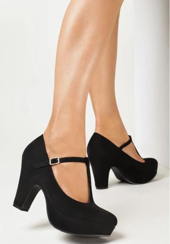 Półbuty Leneisho na niewysokim słupku i platformie. Na wysokości śródstopia cienkie paski, w tym jeden zapinany na sprzączkę. Uwaga: wąska cholewka. Kolor: Czarny Rozmiarówka: Typowa Tęgość stopy: Wąski Rodzaj obcasa: Słupek Wkładka/wyściółka: Ekoskóra Materiał: Ekozamsz Nosek buta: Okrągły Zapięcie: Sprzączka Sezon: Przejściowy Wysokość obcasa: 9.5 cm