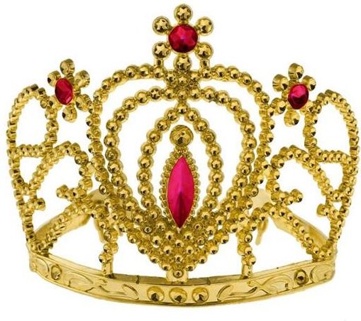 Diadem (korona królowej) z rubinami. Przepiękna złota korona, diadem dla królowej z czerwonymi ozdobami imitującymi rubiny.Specyfikacja:• wysokość: 9.0 cm• średnica: 11.5 cm• kolor: złoty• materiał: 100% plastik