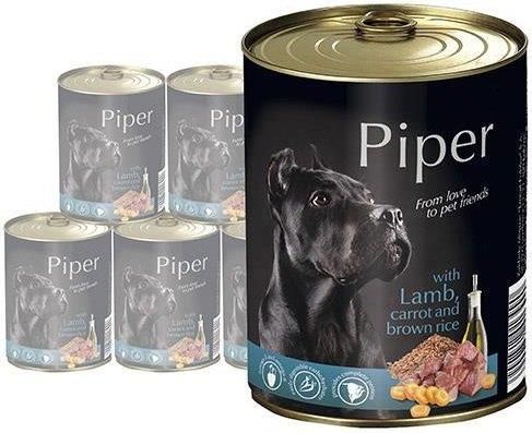 Karma PIPER z jagnięciną i marchewką Karma jest źródłem wysokiej jakości białka bogatego w aminokwasy takie jak lizyna i leucyna. Jagnięcina stanowi cenne źródło żelaza i miedzi – składników mineralnych podnoszących odporność organizmu Składniki te są też odpowiedzialne za prawidłową funkcję krwi i układu krążenia. Dodatkowo tłuszcz z tego gatunku mięsa charakteryzuje się wysoką zawartością kwasów tłuszczowych z rodziny n-3 i n-6, które poprzez kontrolę procesów zapalnych stymulują funkcje skóry. Dodatek marchewki wzbogaca karmę we włókno pokarmowe dające uczucie sytości i stymulujące pracę przewodu pokarmowego oraz wzbogaca walory smakowe karmy.Skład: mięso i produkty pochodzenia zwierzęcego 60% (w tym 4% płuc jagnięcych), rosół, warzywa (marchew 4%), zboża (ryż naturalny brązowy 4%), oleje i tłuszcze (olej lniany 0,2%), substancje mineralne.Składniki analityczne: białko – 10%, oleje i tłuszcze surowe – 7%, popiół surowy – 2,5%, włókno surowe – 0,8%, wilgotność – 78%, wapń – 0,3%, fosfor – 0,25%.Dodatki: Witamina D3 – 240 IU, Witamina E – 20 mg, E6/Cynk – 13 mg.Opakowanie: 24 puszek po 400g....