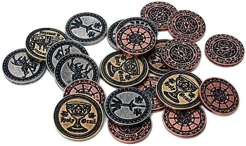 Idealne dla gier osadzonych w Arturiańskiej Anglii Wykonany ze stopów cynku zestaw 24 cudownych, ciężkich monet, które ozdobione zostały motywami wskazującymi wyroby z krainy Arturiańskich legend. Mają praktycznie nieograniczoną ilość zastosowań - sprawdzają się jako realistyczne żetony w takich grach planszowych, jak Caylus, Tainted Grail czy Hansa Teutonica. Są też klimatycznym dodatkiem do sesji RPG oraz nieodzownym elementem LARPów! To najwyższej jakości monety. Są ciężkie - pojedyncza waży tyle co 3 lub 4 pięciozłotówki i ma też o około 5 mm większą średnicę. W zestawie znajduje się: 10 monet miedzianych 8 monet srebrnych 6 monet złotych Te cynkowe monety pokryte zostały grubą warstwą odpowiednio niklu (srebrne), mosiądzu (złote) i miedzi (miedziaki). Powłoki są oksydowane, dzięki czemu wyglądają jakby używane były przez lata.