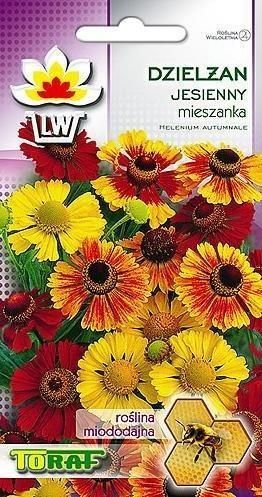 Dzielżan jesienny mix - Helenium autumnale Miododajna bylina chętnie odwiedzana przez pszczoły i motyle. Rośliny wysokości do 1,2 m. Tworzy rozgałęzione łodygi z licznymi kwiatami w kolorze żółto-czerwonym, czerwonym i żółtym. Dzielżan jesienny kwitnie od VII-X. Zastosowanie do obsadzania ogrodzeń, przy ścianach altan, na rabaty bylinowe w kompozycji z innymi wysokimi bylinami takimi jak jeżówki, rudbekie itp. Są idealne do odgradzania poszczególnych części ogrodu. Wymaga stanowiska słonecznego i średnio wilgotnej gleby. Wysiew wprost do gruntu lub na rozsadniku V-VI lub jesienią. Na miejsce stałe sadzić w VIII–IX. Wysokość:100-120 cm Siew:V-VI; poł. VIII-IX Kwitnienie:VII-X Piktogram z rozstawa:50 x 50 cm Oferowane nasiona w opakowaniu o wadze 0,1 g. Oświadczam, że zgodnie z Rozporządzeniem Parlamentu Europejskiego i Rady (UE) 2016/2031 z dnia 26 października 2016 r. w sprawie środków ochronnych przeciwko agrofagom roślin, zmieniającym rozporządzenia Parlamentu Europejskiego i Rady (UE) nr 228/2013, (UE) nr 652/2014 i (UE) 1143/2014 oraz uchylającym dyrektywy Rady 69/464/EWG, 74/647/EWG, 93/85/EWG, 98/57/WE, 2000/29/WE, 2006/91/WE i 2007/33/W do każdej jednostki handlowej dołączony jest paszport roślin. Zamieszczone zdjęcia w naszych ofertach są autorskie i przedstawiają tylko nasze wyhodowane rośliny. Sadzonki roślin w zależności od pory roku mogą się różnić wyglądem np. barwą liści, brakiem ulistnienia, przebarwieniem kory, brakiem części nadziemnej (szczególnie dotyczy bylin) itp. Wszystkie zamówienia realizujemy przez cały rok kalendarzowy wg kolejności zamówień. Rośliny wysyłamy od poniedziałku do czwartku (do godziny 12.00) z gwarancją dotarcia na drugi dzień do klienta. Zapraszamy do skorzystania z naszej szerokiej oferty roślin ozdobnych i nasion.