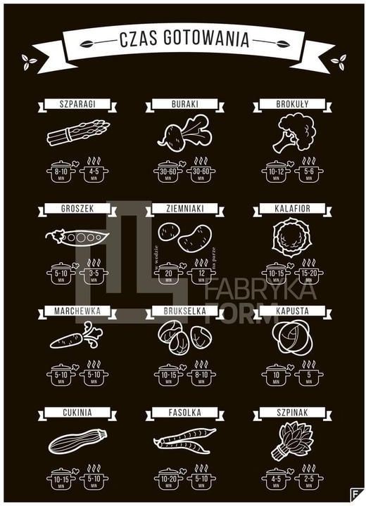 CZAS GOTOWANIA Plakat „Czas Gotowania” to przewodnik po gotowaniu warzyw tak, aby zawsze były smaczne. Nieważne czy gotujesz je w wodzie czy na parze, jeżeli skorzystasz z naszej infografiki, zawsze będą idealne: Miękkie i soczyste, ale także chrupiące. Ten plakat jest częścią zestawu. Możesz stworzyć dowolną kombinację, która będzie najlepiej pasowała do twojego wnętrza. Jeżeli potrzebujesz wszystkich informacji w jednym miejscu, polecamy plakat: Kitchen First Aid Kit / Niezbędnik Kulinarny Plakaty wydrukowano na grubym niepowlekanym papierze archiwalnym (350g). Rozmiary powyżej 40x50cm drukujemy pigmentowo na niepowlekanym papierze o gramaturze 300g. Każdy plakat jest sygnowany przez projektanta. Będziesz pozytywnie zaskoczony niespotykaną jakością druku i zapakowania! PRZEDMIOTEM SPRZEDAŻY JEST SAMA GRAFIKA, BEZ RAMY.