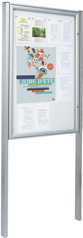 Gabloty zewnętrzne Classic z słupkami to idealne gabloty do umieszczenia w reprezentatywnych miejscach, przy budynkach publicznych, urzędach. Wykonane z niezwykłą dbałością o szczegóły, zarówno estetyczne jak i praktyczne. – gablota zewnętrzna jednostronna do montażu na słupkach – rama z aluminium o grubości 58 mm – do montażu na nogach do wbetonowania – wykończenie anodowane srebrne, bez plastikowych narożników – do wyboru różne formaty gabloty mieszczące od 4 do 21 formatów A4 – drzwi otwierane na bok – wymienne i odwracalne bez konieczności zdejmowania gabloty; drzwi otwierane do góry przy szerokości gabloty 1330mm i 1600mm – niewidoczne zawiasy, co dopełnia profesjonalny wygląd – oszklenie z tworzywa pleksi odpornego na uderzenia lub ze szkła bezpiecznego(opcja na zamówienie) o grubości 4mm – zamykana na zamek z kluczem – integralne zawiasy wewnątrz ramy, odporne na zużycie i zniszczenie – uszczelnienie z elastomeru z otworami zapobiegającymi kondensacji pary wodnej – spód z blachy cynkowanej polakierowanej na biało – wyposażenie dodatkowe stanowią dwa słupki aluminiowe 60x40mm, których montaż odbywa się poprzez wbetonowanie bezpośrednio do podłoża (wysokość całkowita 2600mm) – opcje na zamówienie : gabloty malowane w kolorach: bordowy, niebieski, zielony, brązowy; słupki do montażu poprzez przykręcenie na płycie mocującej (wysokość całkowita 2200 mm); tabliczki tytułowe, słupki do tabliczek tytułowych; zestaw oświetleniowy LED – o szczegóły zapytaj sprzedawcę
