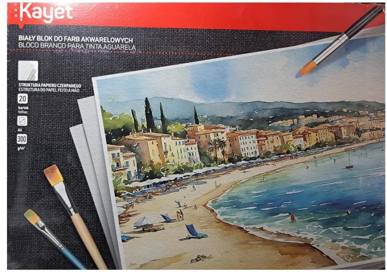 Blok do akwareli Kayet A4 20 szt. to produkt, który z pewnością zadowoli artystów poszukujących najwyższej jakości materiałów do malowania akwarelami. Blok posiada miękką okładkę i 20 kartek o gramaturze 300 g/m², co pozwala na uzyskanie żywych i intensywnych kolorów. Kolor papieru to biel, co dodatkowo podkreśla intensywność kolorów. Produkt jest idealny dla artystów, którzy cenią sobie profesjonalizm oraz doskonałą jakość swoich prac. Cechy produktu: - Rodzaj: blok do akwareli - Marka: Kayet - Format: A4 - Gramatura: 300 - Okładka: miękka - Liczba kartek: 20 - Kolor papieru: biel