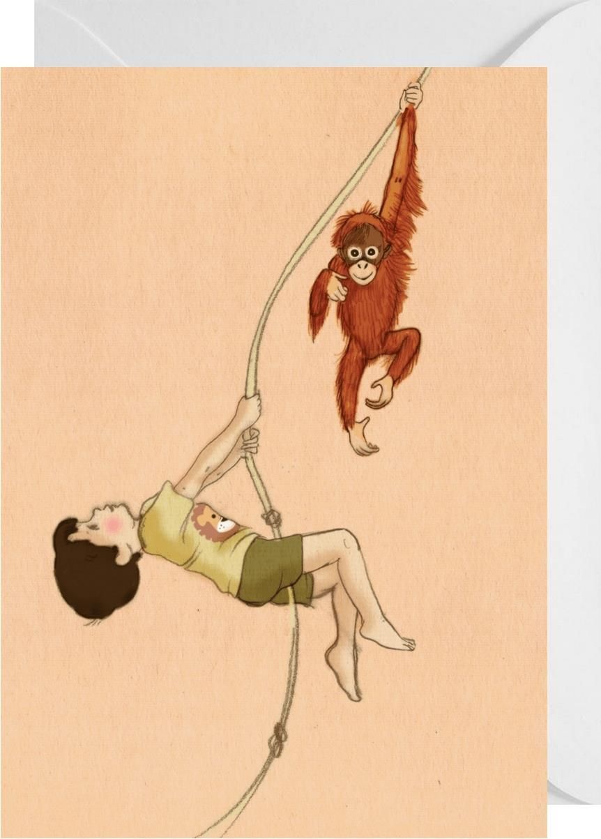 Karnet okolicznościowy Belle&Boo - Małpie figle. Kartki uosabiają istotę dziecięcych zabaw, przygód i marzeń. Przedstawiają dzieciństwo w czystych przyjemnościach, takich jak pluskanie się w kałużach, zabawy w piasku, puszczanie latawców, przebieranki za ulubione postaci czy przyjęcia …