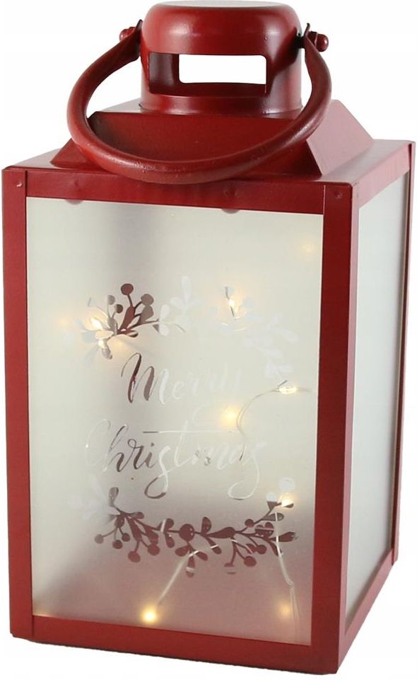 Latarenka świąteczna metalowa 12x23 cm Świąteczna metalowa latarenka w kolorze czerwonym to wyjątkowa dekoracja, która wprowadzi ciepły, przytulny nastrój do każdego wnętrza. Na matowych szybkach znajduje się świąteczny napis „Merry Christmas” oraz delikatny motyw gałązek, które pięknie odbijają światło LED. Latarenka emituje przyjemne, ciepłe światło, doskonale prezentując się na stole, parapecie lub komodzie. Zalety produktu • Wbudowane światełka LED w kolorze ciepłej bieli tworzą nastrojową atmosferę • Wykonana z trwałego metalu i szkła – idealna na lata • Posiada praktyczny uchwyt do przenoszenia lub zawieszenia • Funkcja timera 6/18 h – automatyczne wyłączanie po 6 godzinach świecenia • Doskonała jako dekoracja świąteczna lub prezent Parametry • Materiał: metal, szkło • Kolor: czerwony • Wzór: napis „Merry Christmas” z motywem gałązek • Wymiary: 12,5 × 23,5 cm • Źródło światła: 10 diod LED (ciepła biel) • Zasilanie: 2 × bateria AA (brak w zestawie) • Funkcja timera: 6/18 h • Waga: ok. 700 g