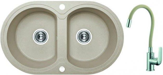 LAVEO DAFNE zlewozmywak 2-komorowy granit+ bateria zlew granit beż SGD 420T DAFNE powstał w ślad za trendami w nowoczesnej aranżacji kuchni. Posiada duży odpływ 3,5’ z przelewem, chromowane zaślepki oraz 10-letnią gwarancję. Idealnie komponuje się z chromowanymi bateriami o nowoczesnym designie, na przykład w kształcie litery U lub F. Jest produkowany w Polsce, dostępny w kolorze beżowym i czarnym. SPECYFIKACJA TECHNICZNA Typ: zlewozmywak wpuszczany Rodzaj: 2 komory Rozmiar: 780 x 470 mm Materiał: 80% minerały, 20% żywice poliestrowe Kolor: beż Przelew: w komorze Gwarancja: 10 lat W zestawie: syfon z przelewem, silikon LAVEO LETE bateria zlewozmywakowa z wylewką typ U BQX 468D beż Rodzina ekskluzywnych baterii do nowoczesnych kuchni. Wysoką jakość wykonania połączono tu z nowoczesną technologią i systemem oszczędzania wody dzięki użyciu perlatorów Typ: baterie mieszakowe Wykończenie: beż Głowica: ceramiczna 35 mm Gwarancja: 5 lat