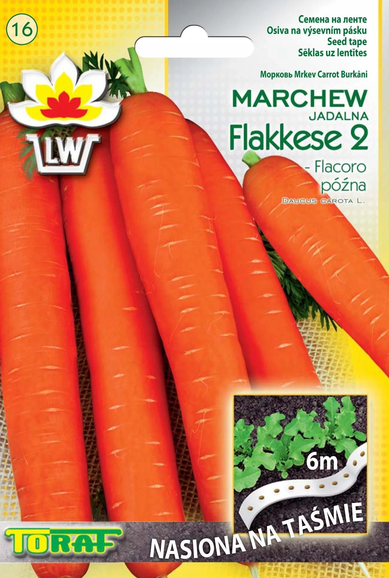 Marchew Flakkese 2 późna - Odmiana późna, bardzo plenna. Korzenie duże, długie 17-22 cm, bez skłonności do gromadzenia azotanów. Skórka gładka. Miąższ intensywnie pomarańczowy słodki, zawiera dużo karotenu. Nadaje się do bezpośredniego spożycia i do przetwórstwa, na soki i mrożonki. Taśma nasienna ułatwia wysiew, dzięki odpowiedniemu rozmieszczeniu nasion na taśmie eliminując potrzebę stosowania przerywki i pozwala na uzyskanie dobrych plonów.Opakowanie zawiera 6 m taśmy nasiennej WARUNKI UPRAWY:1. Przygotować podłoże usuwając kamienie i grabiąc w celu wyrównania i rozdrobnienia powierzchni ziemi.2 Wykonać w ziemi płytki rowek ok. 1,5cm gł. rozłożyć taśmę, przykryć warstwą podłoża.3. Obficie podlać i utrzymywać wilgotność nie dopuszczając do przesuszenia w celu ułatwienia kiełkowania. Siew:½ IV- początek VIIZbiór:VII- początek XI Oferowane nasiona w opakowaniu zawierające 6 metrów taśmy nasion. Oświadczam, że zgodnie z Rozporządzeniem Parlamentu Europejskiego i Rady (UE) 2016/2031 z dnia 26 października 2016 r. w sprawie środków ochronnych przeciwko agrofagom roślin, zmieniającym rozporządzenia Parlamentu Europejskiego i Rady (UE) nr 228/2013, (UE) nr 652/2014 i (UE) 1143/2014 oraz uchylającym dyrektywy Rady 69/464/EWG, 74/647/EWG, 93/85/EWG, 98/57/WE, 2000/29/WE, 2006/91/WE i 2007/33/W do każdej jednostki handlowej dołączony jest paszport roślin. Zamieszczone zdjęcia w naszych ofertach są autorskie i przedstawiają tylko nasze wyhodowane rośliny. Sadzonki roślin w zależności od pory roku mogą się różnić wyglądem np. barwą liści, brakiem ulistnienia, przebarwieniem kory, brakiem części nadziemnej (szczególnie dotyczy bylin) itp. Wszystkie zamówienia realizujemy przez cały rok kalendarzowy wg kolejności zamówień. Rośliny wysyłamy od poniedziałku do czwartku (do godziny 12.00) z gwarancją dotarcia na drugi dzień do klienta. Zapraszamy do skorzystania z naszej szerokiej oferty roślin ozdobnych i nasion.