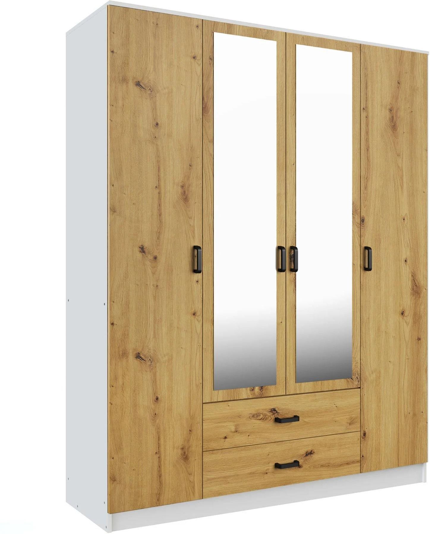 Szafa Cento II 160x200 4D2S biały / dąb artisan z lustrem to funkcjonalny i stylowy mebel, który wnosi do wnętrza naturalne ciepło drewna w nowoczesnej oprawie. Kontrastowe połączenie białego korpusu z wyrazistym dekorem dąb artisan na frontach tworzy harmonijną kompozycję, która doskonale sprawdzi się zarówno w sypialni, garderobie, jak i przedpokoju. Model wyposażony został w cztery uchylne drzwi, dwanaście zamkniętych półek oraz dwie dolne szuflady, które umożliwiają wygodne przechowywanie ubrań i dodatków. Fronty środkowe zostały uzupełnione o wysokie lustra, które optycznie powiększają przestrzeń i dodają wnętrzu lekkości. Całość wykonano z trwałej płyty laminowanej o grubości 16 mm, wykończonej obrzeżem PCV. Czarne uchwyty z tworzywa sztucznego i precyzyjne rolkowe prowadnice dopełniają użytkowego komfortu. Szafa ma 160 cm szerokości, 205 cm wysokości oraz 52 cm głębokości i przeznaczona jest do samodzielnego montażu. Jej uniwersalny styl wpisuje się w aranżacje klasyczne, skandynawskie, japandi, boho oraz nowoczesne.