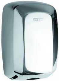 Suszarka do rąk Merida Machflow suszy dłonie silnym strumieniem powietrza bez grzałki oszczędzając od 80% do 90% energii elektrycznej w porównaniu do tradycyjnych suszarek. Cykl suszenia skrócony do 8-12 sekund w zależności od ustawionej mocy/prędkości, daje możliwość zainstalowania jednej suszarki w łazience o natężeniu ruchu wymagającym 2 lub 3 tradycyjnych suszarek. Podczas pracy wytwarza maksymalnie 75 dB. Konstrukcja wandaloodporna. Właściwości suszarki do rąk z serii Machflow: Działa automatyczne w oparciu o fotokomórkę z regulowaną czułością. Urządzenie ma I klasę bezpieczeństwa elektrycznego, z uziemieniem. Suszy silnym, intensywnym, równym strumieniem powietrza o temperaturze pokojowej. Prędkość powietrza z suszarki regulowana w zakresie od 210 do 325 km/h. Wyposażona w system wykrywający obiekty statyczne. Suszarka wyłączy się po kilku sekundach od wykrycia półki, umywalki, itp. Suszarka w celu ochrony silnika po 60 sekundach ciągłej pracy automatycznie wyłącza się. Wyposażona w wysokoobrotowy silnik stopniowo zwiększający obroty, co wydłuża okres sprawnego działania suszarki. Obudowa wykonana ze stali polerowanej o grubości 1,5 mm. Dostępne dwa inne wykończenia obudowy tego modelu: biała lakierowana oraz stal matowa. Parametry szerokość 21,3 cm wysokość 33 cm głębokość 17 cm waga 4,7 kg bryzgoszczelność IP 23 wydajność skuteczna 2,01 - 3,16 m³/min prędkość powietrza 200-325 km/h moc wyjściowa 420-1150 W