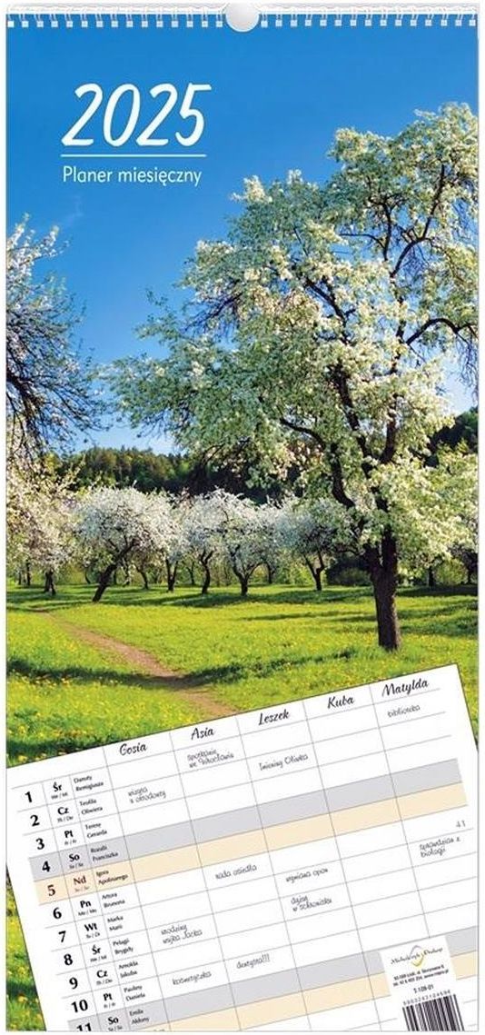 Kalendarz Planer Ścienny Rodzinny dla 5 Osób Miesięczny 2026 T-109-01 Praktyczny kalendarz planer miesięczny na rok 2026 od renomowanego producenta Michalczyk i Prokop to idealne rozwiązanie dla osób ceniących porządek i przejrzystość w planowaniu codziennych obowiązków. Dzięki dużemu formatowi 471x218 mm zapewnia sporo miejsca na notatki i pozwala w prosty sposób zaplanować zajęcia dla całej rodziny. Układ kalendarium został opracowany tak, aby jeden miesiąc zajmował jedną stronę. To przejrzyste rozwiązanie ułatwia szybkie sprawdzenie najważniejszych terminów i wpisanie indywidualnych notatek. Każdy z 12 miesięcy drukowany jest w pełnym kolorze, co dodatkowo podnosi czytelność i estetykę planera. Kalendarz wykonany został na białym papierze offsetowym o gramaturze 80 g/m², który dobrze sprawdza się przy pisaniu zarówno długopisem, jak i ołówkiem czy cienkopisem. Główka kalendarza również została zaprojektowana w pełnym kolorze, co nadaje całości eleganckiego i nowoczesnego wyglądu. format: 471x218 mm rodzaj papieru: offset 80g/m2 biały układ kalendarium: 1 miesiąc - 1 strona ilość stron: 12 druk: pełnokolorowy Główka pełnokolorowa. Możliwość zaplanowania zajęć dla całej rodziny. Kalendarz Rodzinny 2026 – Wszystko pod kontrolą! Masz dość gubienia się w planach zajęć domowników? Ten ścienny planer rodzinny to idealne rozwiązanie, aby zapanować nad codziennymi obowiązkami, zajęciami szkolnymi, spotkaniami i wizytami. Zaprojektowany z myślą o rodzinach do 5 osób, pomoże Wam w łatwy i przejrzysty sposób zorganizować rok 2026. Najważniejsze cechy Przejrzysty układ miesięczny: Każdy miesiąc na osobnej planszy, co pozwala na łatwe planowanie z wyprzedzeniem. 5 kolumn: Osobne kolumny dla każdego członka rodziny umożliwiają zapisywanie planów, zajęć i terminów. Duże pole na notatki: Dodatkowe miejsce na zapisywanie ważnych informacji, list zakupów czy zadań do wykonania dla całej rodziny. Naklejki: Dołączone do kalendarza kolorowe naklejki pomogą w wizualnym oznaczaniu ważnych wydarzeń, np. urodzin, wizyt u lekarza czy wyjazdów. Wysoka jakość wykonania: Kalendarz został wydrukowany na grubym papierze, co zapewnia trwałość i jest idealne do pisania ołówkiem lub długopisem.