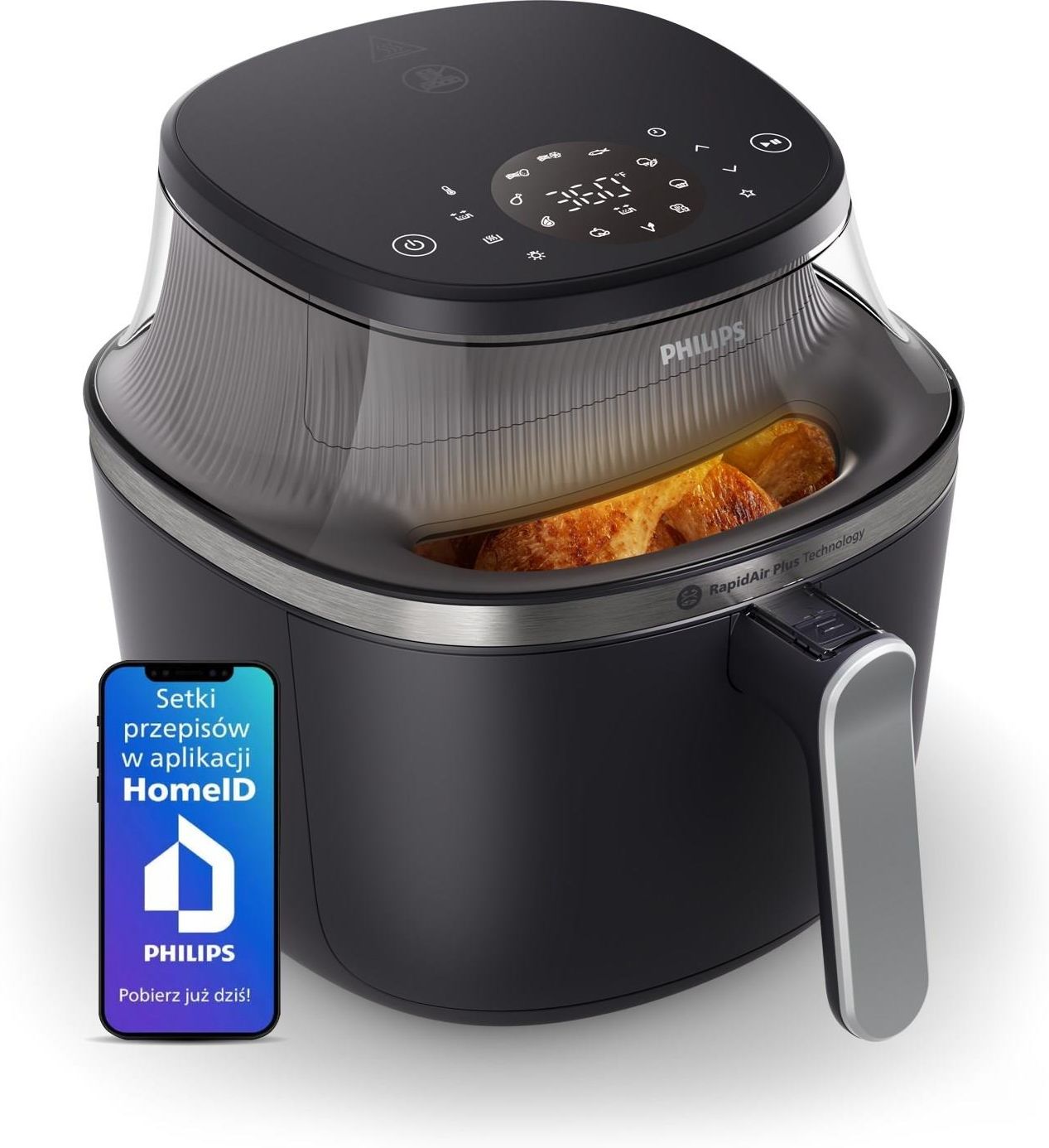 Philips Ovi Single Basket 7,2l serii 3000 Ovi 7,2 l NA341/00 Zobacz skwierczenie, skosztuj różnorodności 16 funkcji, od szybkiego pieczenia po wielogodzinne przyrządzanie potraw. Pyszne, domowe posiłki w kilku prostych krokach. A dzięki stylowemu okienku widać, kiedy potrawa jest chrupiąca, delikatna i gotowa do podania. Szybkie, równomierne gotowanie dzięki technologii RapidAir Plus Opatentowana technologia RapidAir Plus z unikatową konstrukcją w kształcie gwiazdy pozwala na szybszą cyrkulację gorącego powietrza wokół i w środku żywności, zapewniając równomierne gotowanie wewnątrz i na zewnątrz, a tym samym smaczne domowe posiłki w czasie krótszym o 30%* Stylowe okienko, aby mieć oko na jedzenie Koniec zgadywania. Obserwuj podczas gotowania i zobacz, kiedy potrawa jest perfekcyjnie przygotowana. Zaprojektowane, aby gotować w dobrym stylu. Zachowaj pełnię smaku 83% naszych klientów uważa, że udka z kurczaka pieczone w urządzeniu Airfryer serii 3000 firmy Philips smakują lepiej niż te pieczone w piekarniku.****** Wytapianie i izolowanie tłuszczu dzięki unikalnemu koszykowi Do 40% nadmiaru tłuszczu ścieka, zapewniając zdrowsze posiłki o pełnym smaku***. Koszyk oddziela jedzenie od tłuszczu gromadzącego się na patelni podczas gotowania. Ekran dotykowy i bezproblemowa obsługa Łatwy w obsłudze ekran dotykowy z 12 ustawieniami do wyboru: mrożone frytki, świeże frytki, udka z kurczaka, mięso, ryby, śniadanie, warzywa, babeczki, wegańskie, suszone owoce, utrzymywanie ciepła i ulubiony przycisk, za pomocą którego można zapisać własne ustawienie. Pojemność 7,2 l umożliwia przygotowanie posiłku dla całej rodziny Wystarczająca pojemność na posiłki dla całej rodziny. Mieści do 1400 gramów warzyw, 10 udek z kurczaka, 6 kawałków łososia lub 9 babeczek. Łatwe czyszczenie Urządzenia Airfryer firmy Philips mają nieprzywierającą powłokę i wyjmowane części, które można myć w zmywarce. Będziesz więc spędzać mniej czasu na czyszczeniu, a więcej na delektowaniu się ulubionymi potrawami.