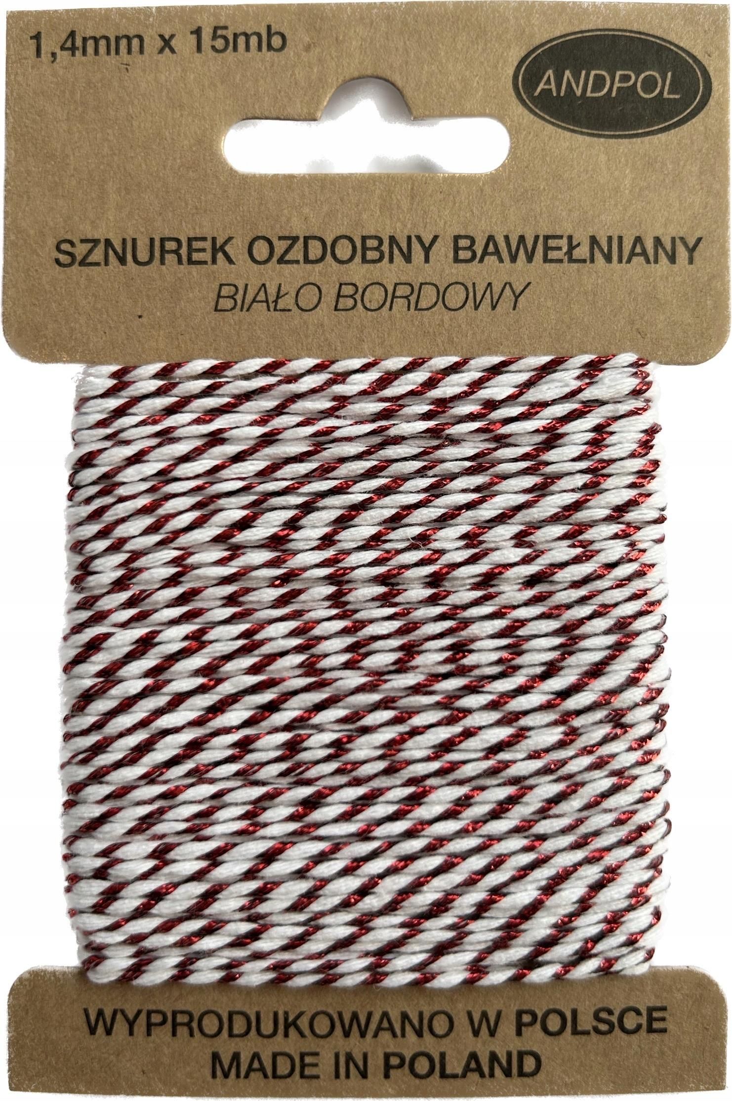 Sznurek ozdobny Elegancki sznurek ozdobny wykorzystamy do wiązania, mocowania różnego rodzaju dekoracji. Pozwoli na wiązanie węzłów dekoracyjnych, mocowanie do serwetek w celu uzyskania szykownej dekoracji stołu oraz zapewni możliwość eleganckiego zapakowania prezentów. Dodatkowo wykorzystamy go przy rękodziele. Zapewni niezwykłą zabawę przy zdobieniu kartek upominkowych. Wytrzymałe materiały, z których wyprodukowany został sznurek pozwolą na wielkokrotne wykorzystanie sznurka, dzięki czemu nadaje się do recyklingu. Delikatnie metalizowany sznurek ucieszy oko i zachwyci każdego obdarowanego. Dane techniczne: Sznurek bawełniany Grubość: 1,4mm Długość: 15mb Kolor: biało bordowy Materiał: bawełna 80%, poliester 20% Zapraszamy do pozostałych naszych ofert, na których można znaleźć inne rodzaje lin, nici oraz sznurków.