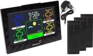 Przenośna stacja meteorologiczna zwana również stacją pogody to nowoczesne urządzenie do domowego użytku, które pozwala na wykonywanie pomiarów w celu precyzyjnej oceny aktualnych warunków atmosferycznych, zarówno wewnątrz pomieszczeń, jak i na zewnątrz! Wyposaż swój dom w takie urządzenie, a zmiany pogody już nigdy Cię nie zaskoczą! Termometr i higrometr — stacja pogody zawsze pokaże aktualne dane na temat temperatury i wilgotności powietrza w Twoim otoczeniu! 3 bezprzewodowe czujniki — dołączone do zestawu, mają zasięg nawet do 60 m i umożliwiają ciągłą kontrolę warunków panujących w różnych pomieszczeniach lub poza nimi np. na tarasie czy balkonie! Kolorowy wyświetlacz z podświetleniem — oprócz temperatury i wilgotności wyświetla aktualną godzinę, datę oraz dzień tygodnia. Urządzenie posiada także budzik! Funkcja pogodynki — to poglądowe piktogramy obrazujące przewidywany stan pogody. Urządzenie wyświetla również wskaźniki tendencji zmian wilgotności i temperatury analizując dane zebrane w przedziale czasowym. Wbudowana pamięć — domowa stacja meteorologiczna umożliwia także zapamiętywanie i sprawdzanie najwyższych oraz najniższych wartości odnotowanych w trakcie pomiarów. Zasilaj tak, jak lubisz — sama stacja pogody może być zasilana bateriami lub podłączona do gniazdka poprzez dołączony do zestawu zasilacz. Czujniki zasilane bateriami. Dzięki opcji wskaźnika niskiego poziomu baterii stacja sama przypomni Ci o ich wymianie! Zaufaj technologii i stwórz swój własny inteligentny dom. Wyposaż swoje wnętrza w niezawodną domową stację meteorologiczną, która nie tylko pomoże Ci w kontrolowaniu temperatury i wilgotności powietrza, ale także spełni funkcję zegara z budzikiem, przewidzi nadchodzące zmiany pogodowe i zaoferuje Ci wiele innych, niezwykle przydatnych funkcji! Sprawdź, jak 3 bezprzewodowe czujniki dołączone do zestawu przekazują informacje o obecnej temperaturze i wilgotności z różnych pomieszczeń, a także z zewnątrz do stacji na odległości nawet do 60 m! Wykorzystaj pamięć wbudowaną w urządzenie i przeglądaj ostatnie zapisane maksymalne i minimalne wartości zanotowanych pomiarów! Odkryj kolorowy, czytelny (podzielony na 6 stref) i podświetlany wyświetlacz — sprawdź na nim aktualny czas (sterowany radiowo), datę, przewidywaną pogodę, a także temperaturę i wilgotność z 4 miejsc jednocześnie! Nie zapomnij o wskaźniku tendencji zmian wilgotności i temperatury! Wykorzystaj stację pogody jako budzik — ustawiając na niej budzik! Nie pomyl terminów i zaplanowanych na dany dzień czynności — dzięki wbudowanemu kalendarzowi i wyświetlanym dniom tygodnia. Pracując na trybie oszczędzania baterii, stacja umożliwia pracę zarówno bezprzewodowo, jak i na dołączonym do zestawu zasilaczu. Czujniki działają jedynie bezprzewodowo i są zasilane bateriami. Specjalny wskaźnik niskiego poziomu baterii zaalarmuje Cię, gdy nastąpi konieczność ich wymiany! Czarna, klasyczna i elegancka obudowa oraz prosty wygląd czujników gwarantują, że urządzenie wpasuje się do każdego wnętrza. Obsługa stacji jest niezwykle łatwa, a rozkładana nóżka umieszczona w tylnej obudowie stacji pozwoli na postawienie jej w każdym wygodnym dla Ciebie miejscu. Czujniki posiadają także otwory umożliwiające ich zawieszenie. Uwaga! Stacja pogody przeznaczona jest tylko do użytku wewnętrznego — poza pomieszczeniami należy umieszczać jedynie same czujniki. FUNKCJE Pomiar temperatury wewnętrznej i zewnętrznej, Pomiar wilgotności wewnętrznej i zewnętrznej, Zegar sterowany radiowo RCC (Radio Controlled Clock), (format wyświetlania godziny 12/24 H), Kalendarz, Wyświetlenie dni tygodnia, Budzik, Funkcja pogodynki, Pamięć zapisująca maksymalną i minimalną wartość zarejestrowanej temperatury oraz wilgotności, Wskaźnik tendencji zmian wilgotności oraz temperatury, Wskaźnik niskiego poziomu baterii. DANE TECHNICZNE Termometr: Format wyświetlania temperatury: °C lub °F Zakres pomiaru temperatur w pomieszczeniu: 0°C (32°F) ~ 50°C (122°F) Zakres pomiaru temperatur na zewnątrz: -30°C (-22°F) ~ 60°C (140°F) Higrometr: Format wyświetlania wilgotności: % RH Zakres pomiaru wilgotności w pomieszczeniu: 20% RH ~ 95% RH Zakres pomiaru wilgotności na zewnątrz: 1% RH ~ 99% RH 3 czujniki zewnętrzne z otworem umożliwiającym powieszenie: Częstotliwość pracy: 433 MHz Zasięg transmisji: 60 metrów (zależny od czynników takich jak rodzaj zabudowy, grubość ścian, zewnętrzne zakłócenia itd. ZASILANIE Stacja pogody: 3 x LR03 AAA (brak w komplecie) Stacja pogody: Zasilacz 4.5 V / 150mA (w komplecie) Każdy czujnik: 2 x LR6 AA (brak w komplecie)