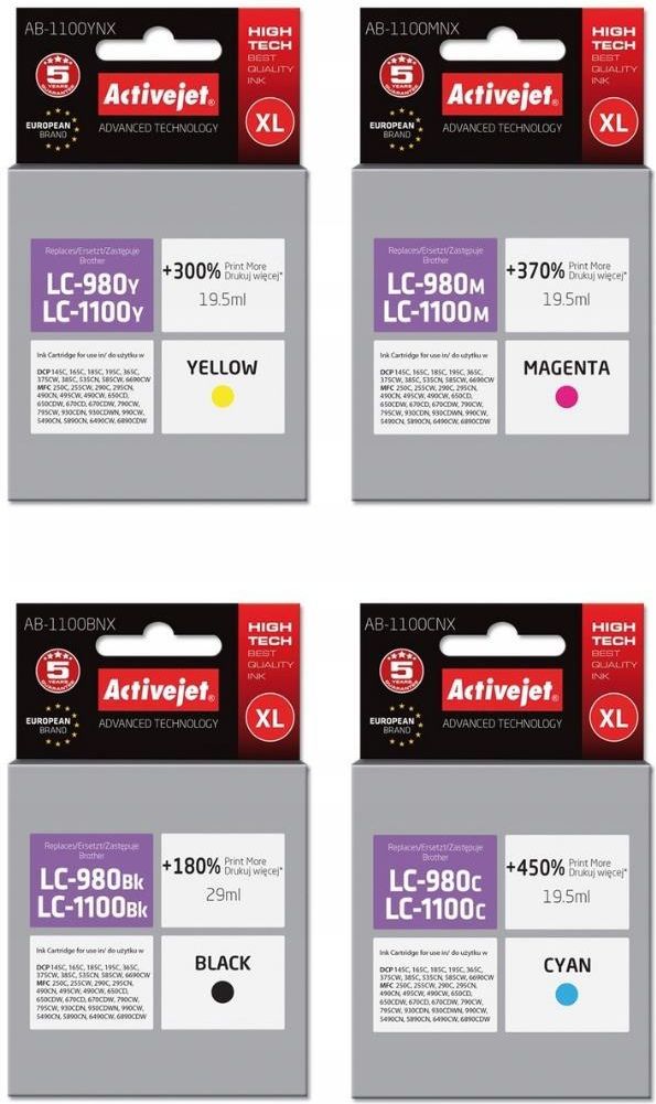 AB-1100BNX Tusz do drukarki Brother zastępuje tusz Brother LC1100BK/980BK Kompatybilność Brother DCP 145C, Brother DCP 165C, Brother DCP 185C, Brother DCP 195C, Brother DCP 365C, Brother DCP 375CW, Brother DCP 385C, Brother DCP 535CN, Brother DCP 585CW, Brother DCP 6690CW, Brother MFC 250C, Brother MFC 255CW, Brother MFC 290C, Brother MFC 295CN, Brother MFC 490CN, Brother MFC 495CW, Brother MFC 490CW, Brother MFC 650CD, Brother MFC 650CDW, Brother MFC 670CD, Brother MFC 670CDW, Brother MFC 790CW, Brother MFC 795CW, Brother MFC 930CDN, Brother MFC 930CDWN, Brother MFC 990CW, Brother MFC 5490CN, Brother MFC 5890CN, Brother MFC 6490CW, Brother MFC 6890CDW Zachwycające kolory  Tusz Activejet AB-1100BNX do Brother LC1100Bk zapewnia nam idealne odwzorowanie kolorów. Ciesz się głębokimi i przenikliwymi barwami, kiedy tylko tego potrzebujesz. Wydruk będzie wyglądał dokładnie tak jak tego oczekujesz.  Pełna kompatybilność  Activejet AB-1100BNX do Brother LC1100Bk to produkt stworzony z myślą o twojej drukarce. Jego używanie nie powoduje skrócenia lub utraty gwarancji. Nie napotkasz też żadnych problemów z samym drukowaniem. Wszystko będzie działać dokładnie tak jak powinno.  Prosta instalacja  Instalacja tuszu Activejet AB-1100BNX do Brother LC1100Bk w drukarce zajmie ci zaledwie kilka minut. Cały proces jest wygodny i niezwykle intuicyjny. Nie potrzebujesz również żadnej specjalistycznej wiedzy.  Miej wszystko pod kontrolą  Dzięki prawidłowo działającemu wskaźnikowi poziomu tuszu w pojemniku nigdy nie zaskoczy cię jego nagłe wyczerpanie. Drukarka w odpowiednim momencie poinformuje cię o tym, że zbliża się czas jego wymiany. Miej wszystko idealnie pod kontrolą!  Dane techniczne Kolor: Czarny Pasuje do urządzeń: Brother Technologia druku: Druk atramentowy Rodzaj naboju z atramentem: Wysoka (XL) wydajność Ilość czarnych wkładów atramentowych: 1 Objętość czarnego tuszu na stronę: 29 ml Model: Zamiennik Rodzaj atramentu: Tusz na bazie pigmentu Rodzaj opakowania: Pudełko Klasa: A+ Technologia: New Wersja: Supreme Rodzaj dostawy: Jednopak Certyfikaty: ISO 9001, ISO 14001, ISO 27001, ISO 28000, TÜV Rheinland (ISO/IEC 19752, ISO/IEC 19798), CE Zgodne rodzaje atramentów: LC-980Bk; LC-1100Bk; Notka dotycząca wydajności strony: +180% print more than OEM Certyfikat środowiskowy (zrównoważonego rozwoju): CE Rodzaj czarnego tuszu: Tusz na bazie pigmentu Zwiększona wydajność względem: OEM +180% Eksploatacja kompatybilna: Brother LC1100BK/980BK EAN: 5901452124816