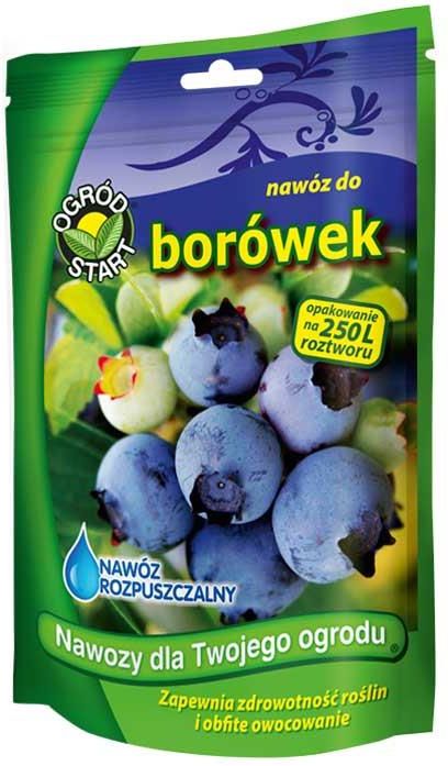 Nawóz do borówek rozpuszczalny Nawóz do borówek jest nowoczesnym, bardzo wydajnym oraz w pełni rozpuszczalnym nawozem krystalicznym. Jest nawozem szybko działającym i doskonale przyswajalnym, a dzięki zawartości makro i mikroelementów w pełni zaspokaja potrzeby pokarmowe roślin. Stosowanie nawozu do borówek zwiększa plonowanie, wybarwienie oraz poprawia walory smakowe owoców. Korzystnie wpływa na prawidłowy wzrost, zdrowotność oraz przezimowanie uprawianych roślin. Skład: Azot (N) 20% Fosfor (P2O5) 20% Potas (K20) 20% Magnez (MgO) 0,5% + mikroelementy (bor, żelazo, miedź, mangan, molibden, cynk) Opakowanie Saszetka 250g Nawożenie: Nawóz stosować w postaci roztworu wodnego w odstępach 14-to dniowych, rozpuszczając 1 łyżeczkę nawozu w 5 L wody (1 g nawozu na 1 L wody). Nawozić od wczesnej wiosny do końca sierpnia, podlewając rośliny do uzyskania wymaganej wilgotności podłoża. W okresie od kwitnienia do owocowania, zalecaną dawkę stosować co 7 dni, uważają aby nie polewać kwiatów.