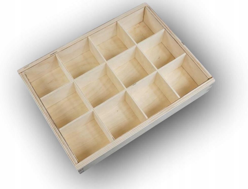Drewniany organizer z przegródkami. Wykonany ze sklejki o grubości 12mm, solidny. Wymiary: 35cm x 26cm x 6cm Wymiary przegródek: 8cm x 7.8cm Ilość przegródek: 12 Produkt bezpośrednio od producenta.
