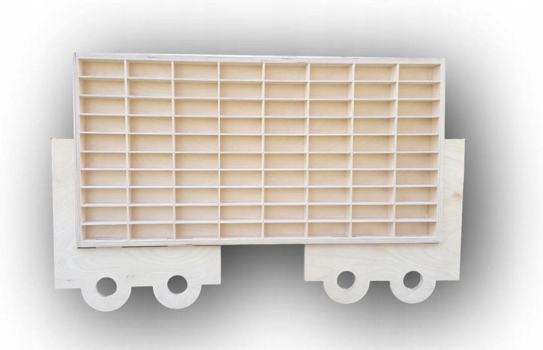 Solidna półka drewniana z przegródkami NACZEPA DO TIRA, który jest dostępny na innych naszych aukcjach. Doskonale spisze się jako wystawka na samochodziki dziecka. Do dyspozycji jest aż 80 miejsc na samochodziki. Kupują Państwo TYLKO naczepę do Tira. Zdjęcia całego Tira z naczepą mają na celu wizualizację, jak może wyglądać złożona półka. Grubość ścianek 12mm Wymiary półki po złożeniu: ok 90cm x 55cm Wymiary bazy na autka: 78,5cmx40cm Głębokość przegródek : 4cm Wymiary przegródek: 9,7cmx3,5cm Potrzebujesz więcej miejsca na autka dziecka , a nie chcesz znów kupować Całego TIR-a, naczepa sprawdzi się idealnie. Można doczepić każdą ilość naczep, ogranicza Cię tylko miejsce na ścianie :) Przegrody wykonane są ze sklejki 3mm Można je dowolnie wyjmować i modyfikować rozmiar przegródek Do każdej półeczki dodajemy gratis zawieszki wraz z wkrętami do zawieszenia półeczki na ścianie. Ze względu na gabaryty ,półkę otrzymują Państwo w elementach do samodzielnego złożenia. W paczce znajdują się 3 elementy które wystarczy ze sobą połączyć. Jest to bardzo prosty zabieg :)