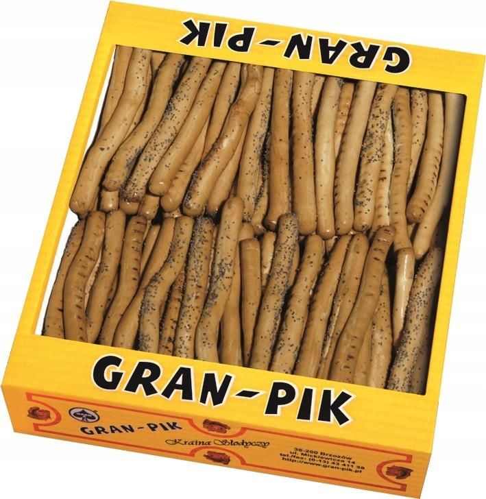 GRAN-PIK JAŚKOWE PALUCHY 2KG Przekąski w kształcie paluchów z makiem firmy GRAN-PIK. Długość każdego palucha to ok.13cm, a grubość około 1,5cm. SKŁADNIKI: mąka pszenna, cukier, tłuszcze roślinne(shea, palmowy) w zmiennych proporcjach, pasteryzowana masa jajowa, mak , sól, drożdże, substancja spulchniająca (węglan sodu). Może zawierać mleko, soję, żyto. Pakowane w opakowanie zbiorcze 2kg, sprzedawane jako całość. Produkt w 100% polski! Nr oferty xSale 12107411174