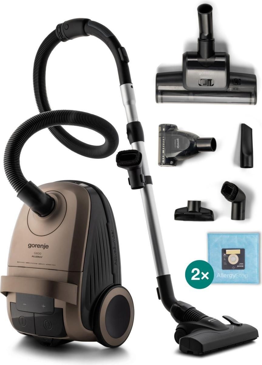 Odkurzacz workowy Gorenje VCE28G6ALLGO 850W, worek 3 l, 73 dB, HEPA H13, kabel 10 m typ: workowy Moc: 850 W Pojemność worka: 3 l Iltr wylotowy: HEPA H13 Filtr wlotowy: mikrofiltr Zasięg pracy: 12 m przewód: 10 m Specyfikacja Techniczna Typ urządzenia: Odkurzacz Rodzaj odkurzacza: Z workiem na kurz Rodzaj odkurzacza: Do czyszczenia na sucho Materiał obudowy: Plastik Kolor: Satynowe złoto Typ rury: Teleskopowa Materiał rury: Aluminium Efektywność Moc ssania: 194 W Przepływ powietrza: 28.3 l/s Pojemność worka na kurz: 3 l Sterowanie Sterowanie: Na urządzeniu Regulacja mocy: Dotykowa Wskaźnik napełnienia worka: Tak Charakterystyka Metoda przechowywania: Stojąco lub leżąco Elastyczny wąż: Tak Sprzęt Uchwyt odkurzacza: Gumowany Koła: Gumowane Liczba kół: 3 szt. Bęben / zwijacz przewodu: Tak Uchwyt na rurę do przechowywania: Tak Liczba filtrów: Wylotowy HEPA H13 + filtr z węglem aktywnym Systemy bezpieczeństwa Zabezpieczenie przed przegrzaniem: Tak Ochrona obudowy (aktywny zderzak): Tak Akcesoria Turboszczotka do mebli Ssawka szczelinowa (wąska) Mała turboszczotka Wieszak na akcesoria Typ worka: GB2 Dołączone worki: 2 szt. z mikrofiltrem antyalergicznym Specyfikacje Średnica rury: 35 mm Długość rury: 900 mm Zasięg (kabel + wąż + rura): 12 m Długość przewodu zasilającego: 10 m Poziom hałasu (maks.): 73 dB(A) Kod filtra wylotowego: 680182, 686995 Szerokość produktu: 310 mm Wysokość produktu: 277 mm Głębokość produktu: 434 mm Szerokość zapakowanego produktu: 325 mm Wysokość zapakowanego produktu: 325 mm Głębokość zapakowanego produktu: 575 mm Masa netto produktu: 7.3 kg Masa brutto produktu: 9.201 kg Masa netto jednostki silnikowej: 5.3 kg Moc znamionowa: 850 W Gorenje VCE28G6ALLGO to elegancki, workowy odkurzacz w satynowym złocie, który łączy wygodę obsługi z solidnym wykonaniem. Regulacja mocy TouchControl pozwala szybko dopasować siłę ssania do podłóg i dywanów, a wskaźnik zapełnienia worka przypomina o wymianie, zanim spadnie skuteczność sprzątania. Za higienę odpowiada filtr HEPA H13 Active Carbon, pomagający ograniczać drobny pył i zapachy. Gumowe kółka dbają o delikatne powierzchnie, teleskopowa aluminiowa rura zapewnia wygodną wysokość pracy, a automatyczny zwijacz przewodu ułatwia przechowywanie po skończonym sprzątaniu. To sprzęt zaprojektowany do codziennego użycia: poręczny, stabilny i gotowy do długich sesji sprzątania bez częstych przerw na wymianę worka. Jeśli szukasz odkurzacza, który wygląda świetnie i sprząta równie dobrze