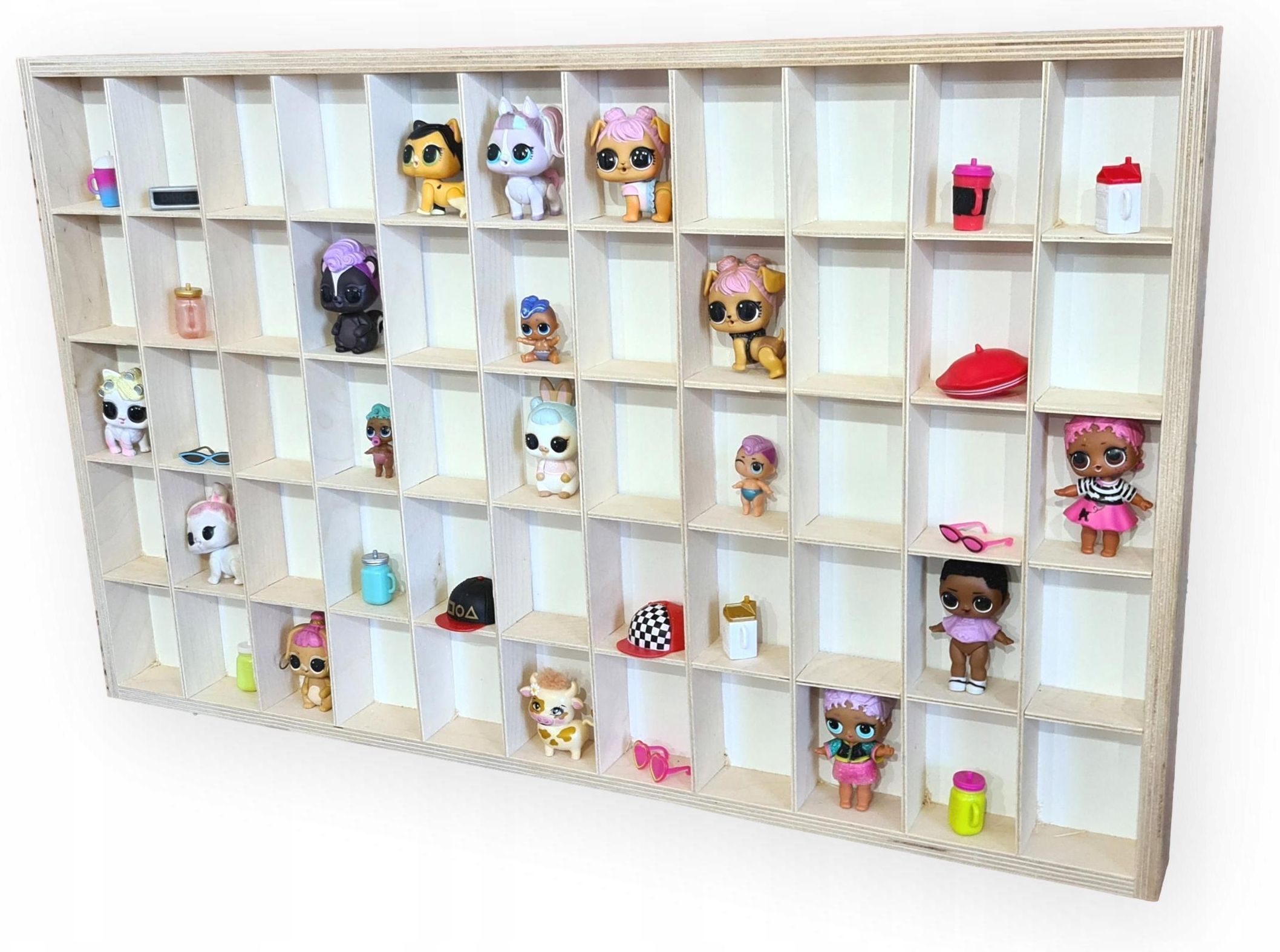 Solidna półka drewniana z przegródkami. Doskonale spisze się jako wystawka na laleczki dziecka. Do dyspozycji jest 55 przegródek. Grubość ścianek 12mm Wymiary: 69cmx43,5cm Głębokość przegródek : 4cm Wymiary przegródek: 6cm x 8cm Przegrody wykonane są ze sklejki 3mm Można je dowolnie wyjmować i modyfikować rozmiar przegródek Do każdej półeczki dodajemy gratis zawieszki wraz z wkrętami do zawieszenia półeczki na ścianie. Laleczki nie są przedmiotem aukcji.