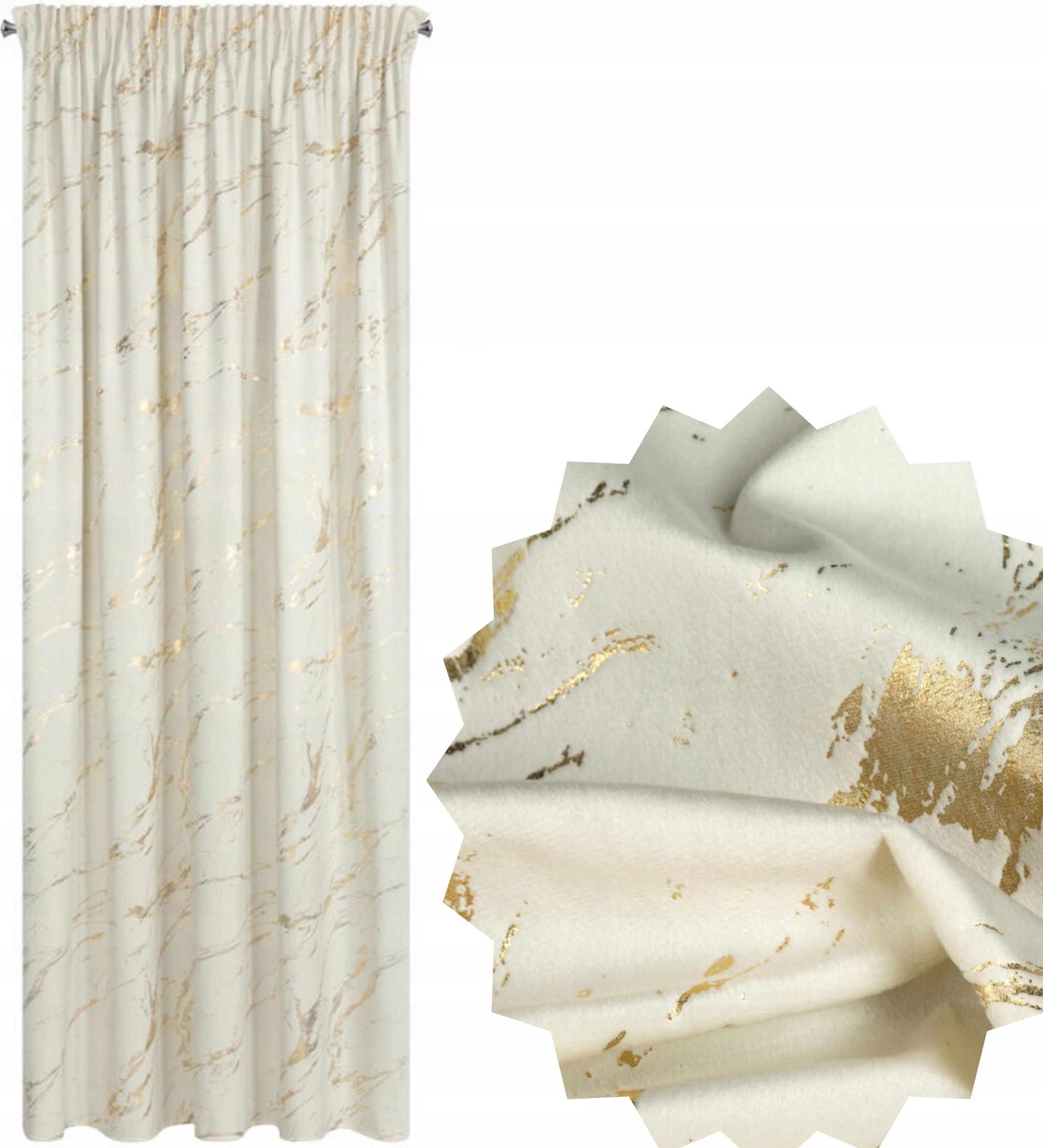 Zasłona Molly 140X270 Na Taśmie Zasłona MOLLY marki Eurofirany wykonana z miękkiej welwetowej tkaniny, ozdobiona eleganckim motywem złotego marmuru to idealna i jednocześnie bardzo praktyczna dekoracja okna do nowoczesnych wnętrz w stylu glamour. Miękka i przyjemna w dotyku tkanina o aksamitnym wyglądzie dodaje wnętrzu przytulnego a zarazem luksusowego charakteru, zaś gruby gęsty splot oraz wysoka gramatura zapewniają dobre krycie i prywatność w dekorowanym pomieszczeniu. Zasłonę, dzięki zastosowaniu taśmy, można łatwo zawiesić na karniszu drążkowym, a równomierne fałdy nadają jej elegancki wygląd. Modny wzór wprowadza do pomieszczenia stylowy akcent, tworząc przytulną atmosferę i modną przestrzeń. Stwórz w swoim mieszkaniu idealną oazę spokoju, mieszkaj pięknie i twórz piękne życie... Zasłona gotowa MOLLY VELVET Szerokość: 140 cm, Wysokość: 270 cm Tolerancja rozmiaru: +/- 5% Kolor: KREM + SZAMPAŃSKI Gramatura: 200 GSM, Skład: 100% poliester Marka: Eurofirany Pranie ręczne w tem. 30 stopni Ilość sztuk w opakowaniu: 1szt Kolory mogą się nieznacznie różnić w zależności od ustawień monitora. Możliwość powieszenia na karniszu drążkowym i przy użyciu żabek.