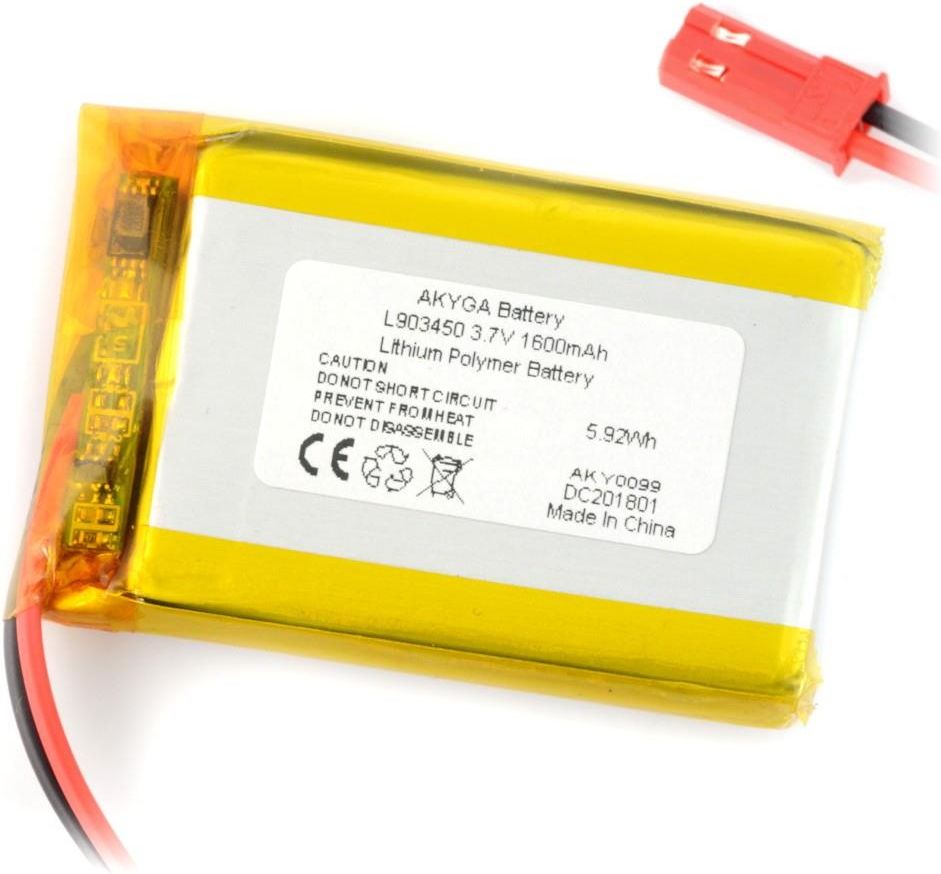 Akumulator Li-Pol Akyga 1600mAh 1S 3,7V - złącze JST-BEC + gniazdo - 50x34x9mm Akumulator marki Akyga wykonany w technologii Li-Pol o napięciu znamionowym 3,7 V oraz pojemności 1600 mAh. Masa wynosi 31 g, a wymiary 50 x 34 x 9 mm. W zestawie przewód zakończony gniazdem JST i wolnymi przewodami. Indeks: AKU-12212 Dane techniczne akumulatora Akyga Typ akumulatora: litowo-polimerowy Napięcie znamionowe: 3,7 V Pojemność: 1600 mAh Zakres temperatury pracy: -20°C do 60°C Nominalny prąd ładowania/rozładowania: 0,2 C (0,32 A) / 0,2 C Maksymalny prąd ładowania/rozładowania: 1 C (1,6 A) / 1 C Długość przewodu zasilania: 150 mm Typ złącza: JST żeńskie 2-pinowe Raster wyprowadzeń: 2,54 mm Zabezpieczenie: PCM Jedno ogniwo (1S) Wymiary: 50 x 34 x 9 mm Masa: 31 g