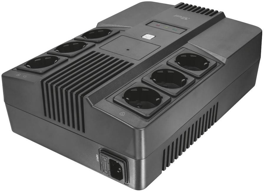 Zasilacz Awaryjny UPS Trust Maxxon 800 VA Kod produktu: CR9147 Zasilacz firmy Trust zasila sprzęt elektroniczny podczas burz i przestojów. Utrzymuje Twój pulpit komputera, monitor lub inne urządzenia (router, modem, telewizor itp.) działające po zaniku zasilania. Zasilacz został specjalnie zaprojektowany tak, aby w trudnych warunkach zmaksymalizować produktywność i wydajność pracy, zapewniając jednocześnie moc w sytuacjach awaryjnych. Zasilanie awaryjne i ochrona przeciwprzepięciowa dla komputerów i elektroniki! https://upload.cdn.baselinker.com/products/3959/1018802951.jpg Podstawowe informacje: Ilość gniazd wyjściowych (szt.): 6 Typy wyjść AC: Schuko Sygnalizacja: Tak Wysokość: 9.3 cm Szerokość: 20.2 cm Głębokość: 29.3 cm Waga zasilacza: 4.5 kg Kolor: Czarny Parametry techniczne: Moc pozorna: 800 VA Automatyczna regulacja napięcia: Tak Normalne napięcie wejściowe: 220-240 Vac Zakres napięcia roboczego:162-290 Vac Akumulatory: Pojemność baterii: 7 Ah Technologia baterii: Kwasowo-ołowiowy Typ baterii: 12 V Liczba baterii: 1