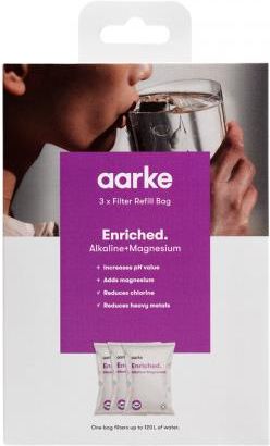3 saszetki z granulkami filtrującymi Aarke Enriched Alkaline + Magnesium do dzbanka Aarke. Granulki filtrujące premium Enriched Alkaline + Magnesium produkowane są dla Aarke przez austriacki koncern BWT. Zadaniem filtra jest redukcja chloru, metali ciężkich i kamienia. Dodatkowo granulki wzbogacają wodę filtrowaną o magnez. Działanie wkładu to również alkalizacja wody poprzez podnoszenie jej pH. W efekcie filtracji woda ma przyjemny smak i zapach oraz jest pozbawiona wielu szkodliwych związków. Opakowanie zawiera 3 saszetki. Każda saszetka wystarcza na 4 tygodnie filtracji lub 120 litrów przefiltrowanej wody (w zależności co nastąpi wcześniej). Składniki granulek: żywica jonowymienna, węgiel aktywny, minerał (magnez) Granulki pasują do szklanego dzbanka Aarke.