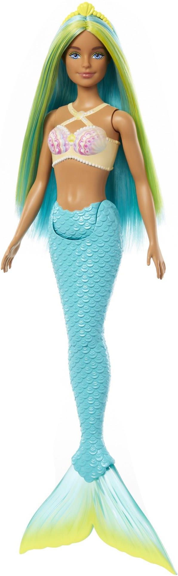 Barbie Syrenka Niebieski ogon Lalka syrena z żółto-niebieskimi włosami, opaską do włosów, muszelkowym topem i turkusowym ogonem Zanurz się w świecie zabawy z pięknymi lalkami syrenkami Barbie®! Każda syrenka ma top inspirowany muszelkami, śliczny ogon i kolorowe włosy. Dzieci od 3 roku życia mogą …