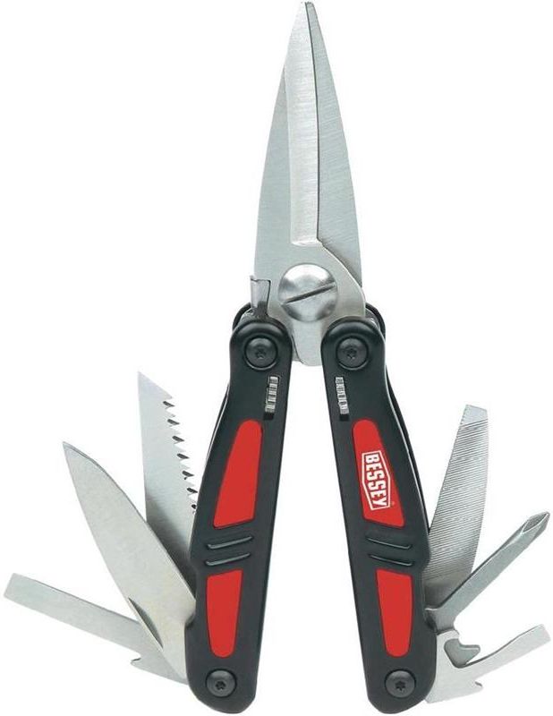 Narzędzie wielofunkcyjne z dużymi nożycami Narzędzie wielofunkcyjne łączące 7 funkcji: nożyce, nóż, piłka, pilnik, wkrętak do wkrętów z wgłębieniem krzyżowym oraz duży i mały wkrętak do wkrętów z rowkiem Do cięcia: skóry, linek, winylu, cienkich kabli, sznurka, cienkiego tworzywa sztucznego, …