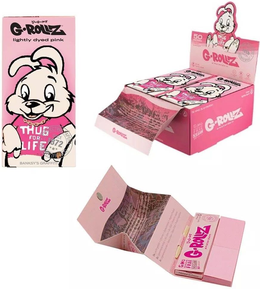 Bibułki G-Rollz Banksy Thug for Life KS Slim z filtrami i tacką Bletki do jointów holenderskiej marki G-Rollz z nadrukiem autorstwa Banksy "Thug for Life". Delikatnie różowe, wykonane z naturalnych włókien roślinnych. Opakowanie zawiera: 50 bibułek, 50 filterków i tackę.