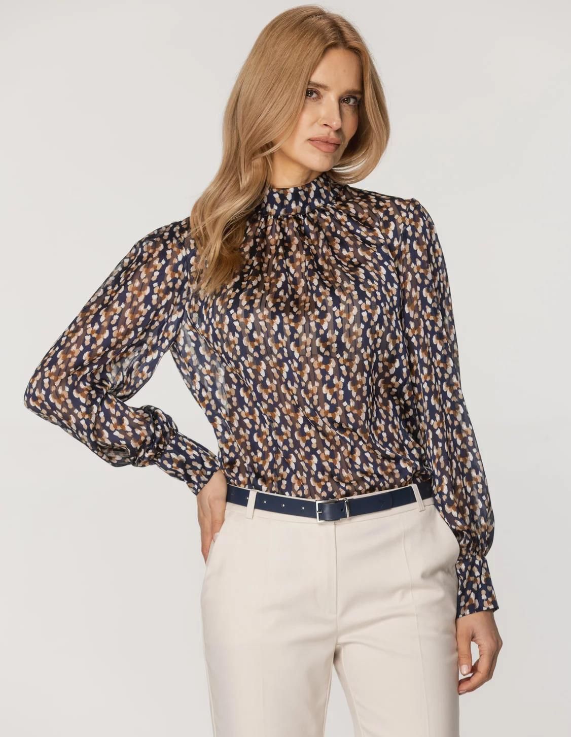Luźna, elegancka damska bluzka typu półgolf Żakardowa bluzka damska z długim rękawem, w kwiecistym wzorze o różnych rozmiarach. Bluzka posiada długie, bufiaste rękawy i wysokie, zapinane na 4 ozdobne guziki mankiety. Ten fason będzie świetnie pasował w eleganckich zestawieniach, dodając im lekkości i kobiecości. Kolor: granatowa w drobne, kolorowe plamki Dekolt: typu półgolf Skład: 100% poliester Jakość: pierwsza Gwarancja: 24 m-ce Wyprodukowano w Polsce
