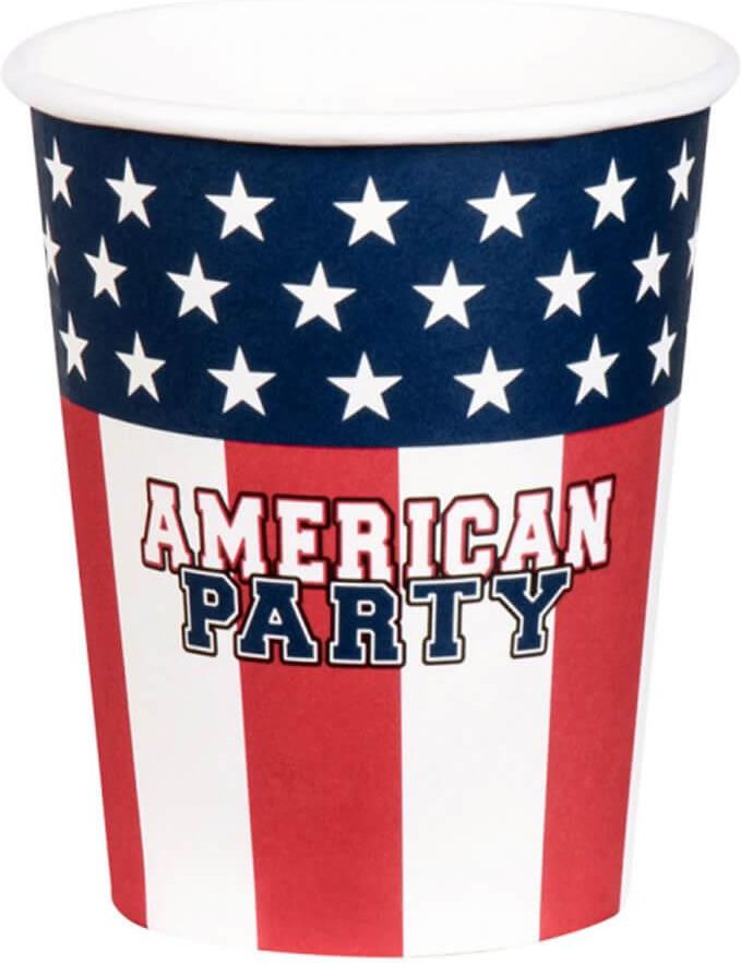 Kubeczki w barwach flagi Stanów Zjednoczonych - USA z napisem American Party, idealne na imprezę w stylu amerykańskim. Pojemność: 210 ml. Opakowanie: 10 szt.