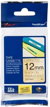 Brother TZe-PR831 Czarny tekst na złotej etykiecie premium 12 mm szerokości, 8 m długości Wysokiej jakości oryginalna kaseta Brother Zapewnia wyraźne i trwałe rezultaty Opis produktu  Brother TZe-PR831 Oryginalna laminowana taśma TZe-PR831 z czarnym nadrukiem na złotym tle jest idealna do tworzenia kartek czy pakowania prezentów. Błyszczące tło nadaje etykiecie wyjątkowy wygląd. Taśmy Brother są niezwykle trwałe i odporne na uszkodzenia dzięki specjalnej technologii laminowania. TZe-PR831 jest kompatybilna z drukarkami etykiet P-touch, które posiadają logo TZ lub TZe na pokrywie z taśmą. Kompatybilne z Brother PT-RL700S, PT-P950NW, PT-P900W, PT-P750W, PT-P710BT, PT-P700, PT-P300BT, PT-H500LI, PT-H500, PT-H300LI, PT-H300, PT-H200, PT-H110, PT-H105WB, PT-H105, PT-E550WVP, PT-E500VP, PT-E500, PT-E300VP, PT-E300, PT-E110VP, PT-E110, PT-E100VP, PT-E100, PT-D800W, PT-D800, PT-D600VP, PT-D600, PT-D450VP, PT-D450, PT-D400VP, PT-D400, PT-D210VP, PT-D210, PT-D200BWVP, PT-D200VP, PT-D200BW, PT-D200, PT-Cube, PT-9800PCN, PT-9700PC, PT-9600, PT-9500PC, PT-9400, PT-9200DX, PT-9200PC, PT-7600VP, PT-7500VP, PT-7100VP, PT-3600, PT-2730VP, PT-2700VP, PT-2500PC, PT-2480, PT-2470, PT-2460, PT-2450DX, PT-2450, PT-2430PC, PT-2420PC, PT-2400E, PT-2400, PT-2100VP, PT-2030VP, PT-1950VP, PT-1850, PT-1830VP, PT-1800E, PT-1800, PT-18R, PT-1750, PT-1290VP, PT-1290DT, PT-1290, PT-1280DT, PT-1280, PT-1260VP, PT-1250S, PT-1250J, PT-1250, PT-1230PC, PT-1200P, PT-1200, PT-1090, PT-1010, PT-1010, PT-1000, PT-900F, PT-550, PT-540C, PT-540, PT-350, PT-340C, PT-340, PT-310, PT-300, PT-220, PT-210E, PT-200, PT-1090, PT-1010, PT-1230PC, PT-1260VP, PT-1280DT, PT-1280VP, PT-1290, PT-1750, PT-1830VP, PT-2030VP, PT-2100VP, PT-2420PC, PT-2430PC, PT-2470, PT-2480, PT-2700VP, PT-2730VP, PT-3600, PT-7100VP, PT-7500VP, PT-9200DX.  Więcej informacji o produkcie  Brother TZe-PR831 Taśma premium TZe-PR831 była poddana rygorystycznym testom w celu otrzymania trwałej i niezawodnej etykiety. Niezależnie od tego, czy chcesz opisywać pliki, foldery w swoim biurze, tworzyć plakietki z nazwiskami, tabliczki z trofeami, czy tworzyć etykiety dla produktów robionych ręcznie, ta taśma zapewni doskonały wygląd każdego produkowanego znakowania. Złożona z wielu warstw, laminowana taśma TZe-PR831 umożliwia tworzenie etykiet, które pozostają tak wyraźne i czytelne, jak w dniu ich wydrukowania. Opatentowana technologia laminowania sprawi natomiast, że będą one odporne na temperaturę, wodę, promienie słoneczne czy ścieranie.