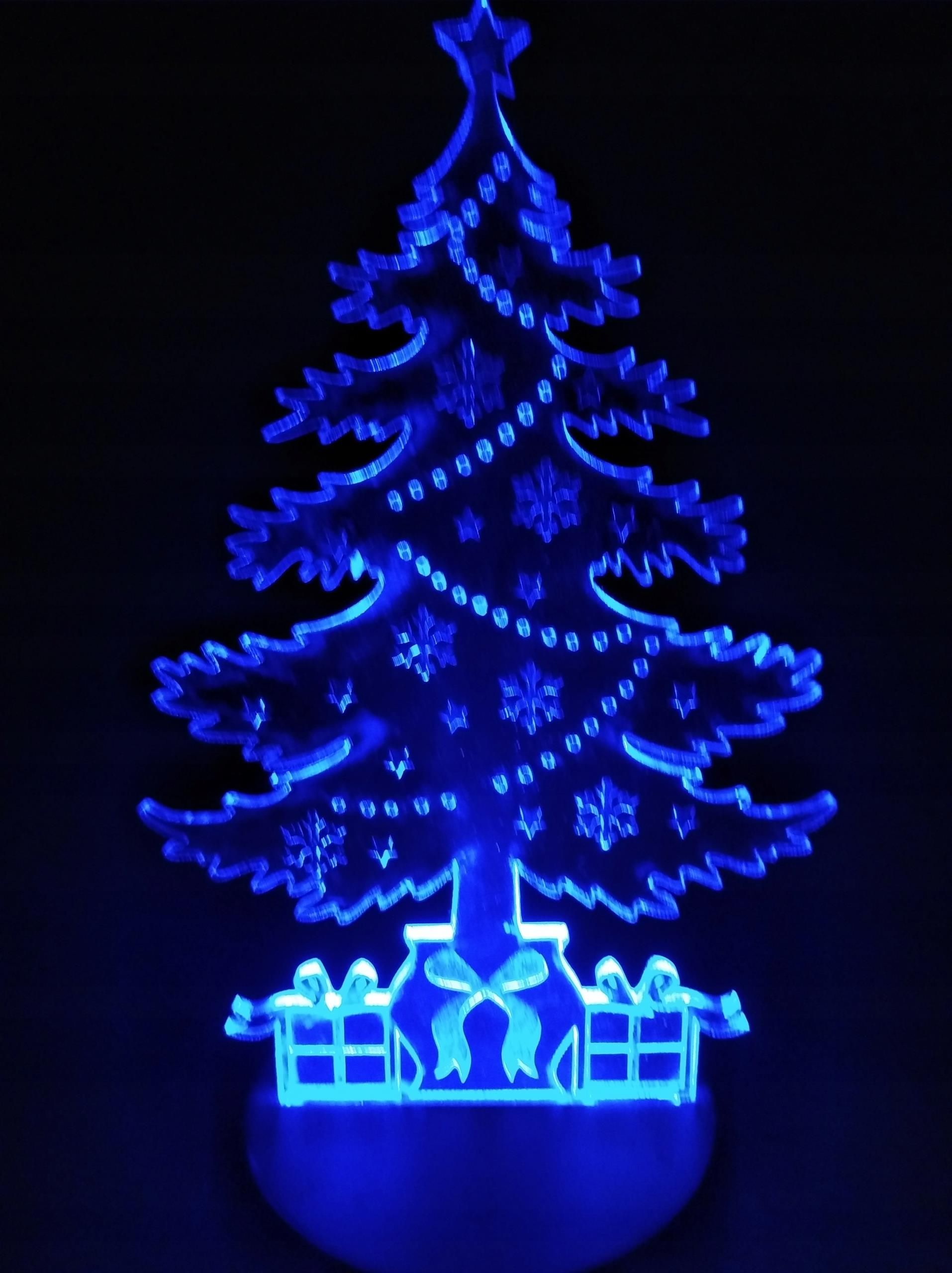 Lampka 3d iluzja choinka grawerowany na plexi gr 4mm wys ok20cm na podstawie zasilanej przez standardową ładowarka smartfonu lub zasilania przez baterii 3xr6.Posiada zmieniające się 7 kolorów podświetlenia, które może zmieniać się automatycznie , ręcznie z pilota lub ustawić na stały kolor ,wys …