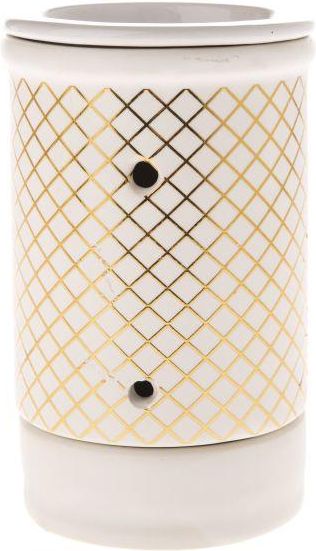 Kominek na wosk lub olejek zapachowy marki Dakls, wykonany z ceramiki. Kominek jest koloru białego, matowego, z ozdobnym, złotym, kratkowanym wzorem. Górna część kominka przeznaczona na olejek zapachowy jest wyciągana, koloru białego. Naczynie umożliwia rozpylenie zapachu wosku lub olejku …
