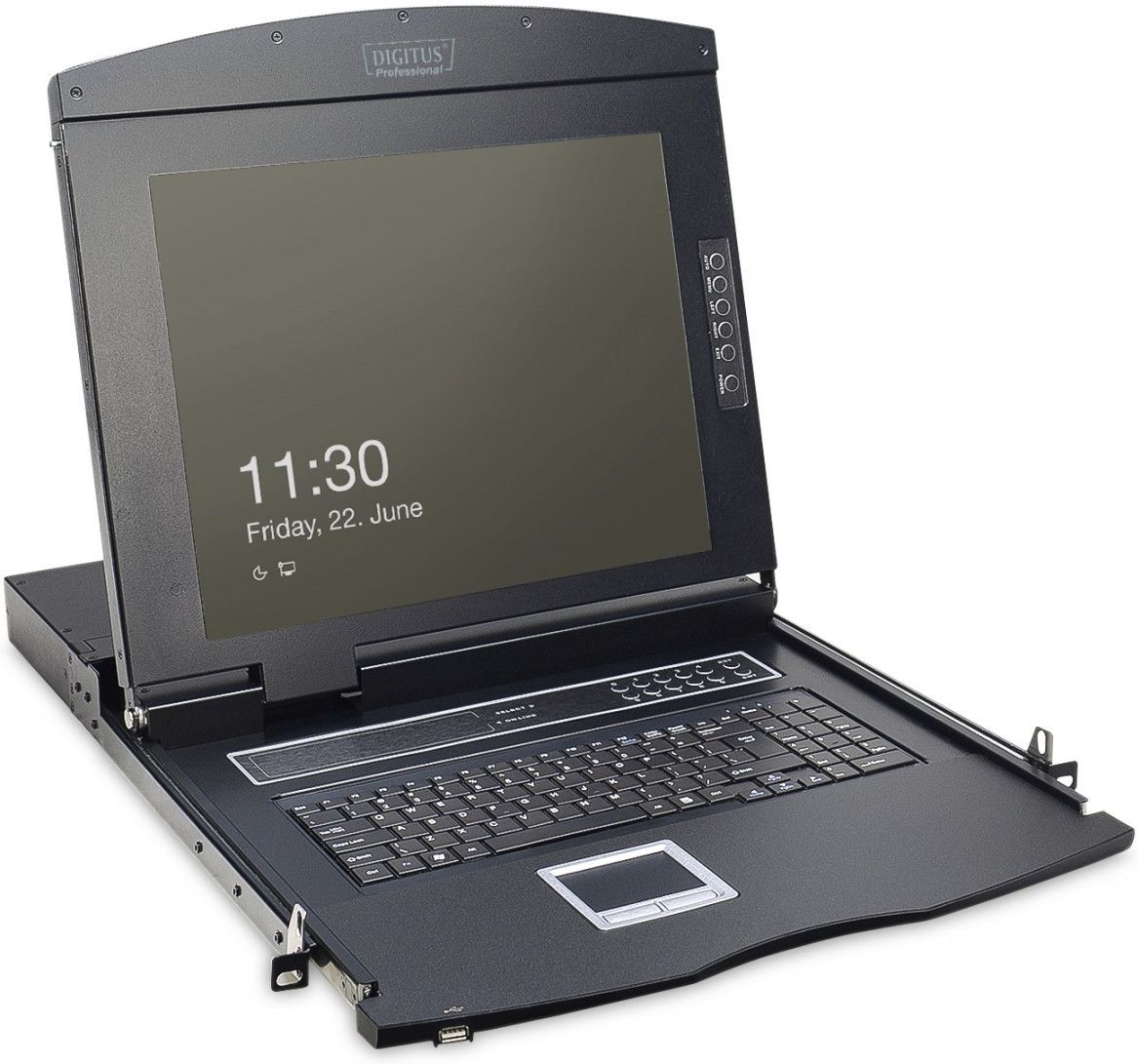 Digitus Konsola modułowa z monitorem TFT o przekątnej 17″ (43,2 cm), 1-portowym przełącznikiem KVM & touchpadem, klawiatura turecka. Długość przekątnej ekranu: 43,2 cm (17"), Rozdzielczość: 1280 x 1024 px, Współczynnik kontrastu (typowy): 1000:1. Interfejs: VGA. Język klawiatury: Turecki. Waga wraz z opakowaniem: 23,4 kg, Szerokość opakowania: 705 mm, Głębokość opakowania: 810 mm