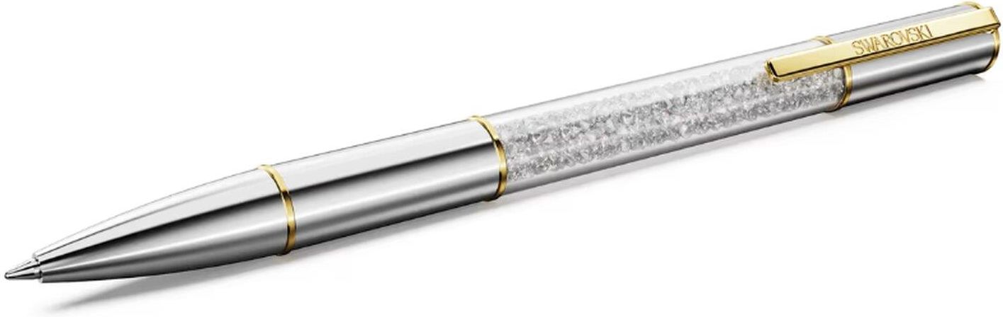 Długopis Swarovski Crystalline Lustre Długopis Crystalline Lustre to połączenie luksusu i kreatywności. Ten wyjątkowy przybór do pisania wyróżnia się okrągłym korpusem w odcieniu srebra oraz akcentami z powłoką w odcieniu złota, takimi jak praktyczny klips z wygrawerowaną nazwą Swarovski. Centralna część tego atrakcyjnego modelu roztacza blask za sprawą około 480 lśniących kryształów, które starannie umieszczono wewnątrz korpusu kultową techniką Crystalline. To wyróżniający się dodatek na biurko lub wyjątkowy prezent dla osób z zamiłowaniem do pisania. Wymienne wkłady z tuszem w czarnym i niebieskim kolorze. Kolekcja: Crystalline Lustre Rozmiar: 14.4 x 1.1 cm Materiał: Kryształy, Powłoka w odcieniu złota, Chromowany Kolor: Odcień srebra Kolor tuszu: Czarny Komfort pisania Długopisy Swarovski zapewniają płynność i wygodę pisania. Ergonomiczny kształt sprawia, że dobrze leżą w dłoni, co jest istotne zwłaszcza dla osób, które dużo piszą. Symbol prestiżu Posiadanie długopisu Swarovski może być oznaką dobrego gustu i klasy. Świetnie sprawdzi się w biznesowym środowisku, podkreślając profesjonalizm właściciela. Wybierając długopis Swarovski masz pewność, że otrzymujesz produkt najwyższej jakości. W zestawie otrzymujesz: Torebkę prezentową Swarovski Pudełko lub pokrowiec Swarovski Certyfikat autentyczności