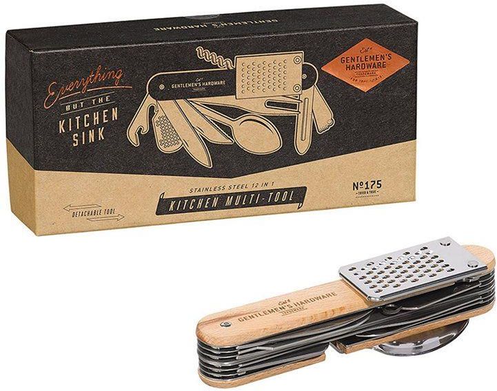 Duży, rozkładany multitool kuchenny 12 w 1 to wyjątkowy sprzęt kuchenny dla miłośnika gotowania w terenie.Zaprojektowany i wykonany z wyjątkową starannością, jest nie tylko ładny, ale też wyjątkowo funkcjonalny.Rozkładany na 2 części i bardzo duży.Idealny dla osób, które uwielbiają stylowe dodatki.Funkcje multi-tool m.in:- 2 ostrza do sera- Tarka do sera- Zester- Łyżka- Otwieracz do puszek- Widelec do sera- Korkociąg do wina- Otwieracz do butelekWykonany z najwyższej jakości materiałów - stali nierdzewnej z czarnym uchwytem.Opakowany w atrakcyjny i trwały sposób. Będzie służył latami.Idealny pomysł na prezent dla faceta.Gentlemen’s Hardware to brytyjska marka akcesoriów stworzona specjalnie dla mężczyzn. Surowy charakter, atrakcyjne wzornictwo i starannie dobrane materiały zapewniają niezwykłe doświadczenie z przedmiotami tej legendarnej marki. Grill, polowanie, kemping, żeglarstwo czy wspinaczka - w ofercie Gentlemen’s Hardware znajdują się setki przydatnych narzędzi i gadżetów, w których zakocha się każdy facet.Sprawdź też inne produkty Gentlemen’s Hardware i znajdź coś wyjątkowego.